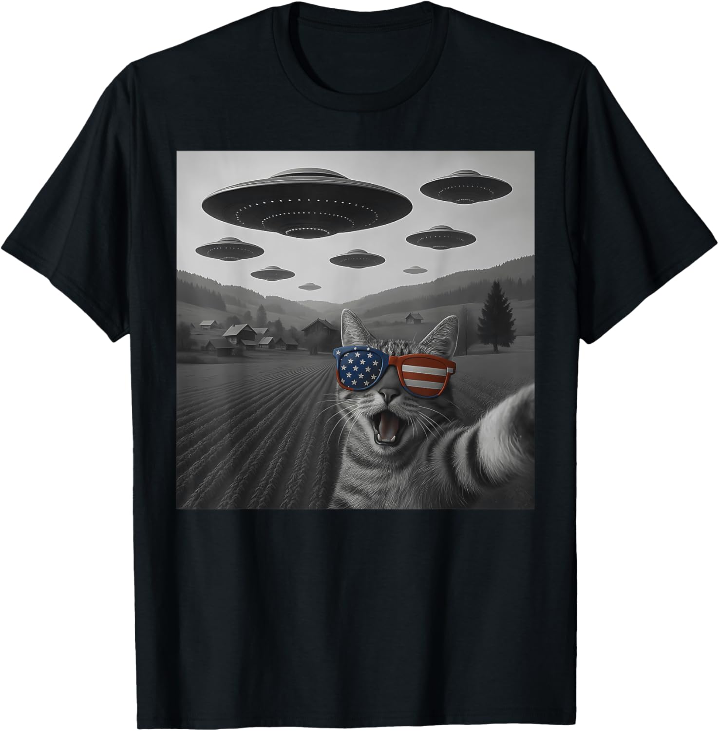 4th Of July Cat Selfie With Alien UFO USA Flag Sunglasses T-Shirt