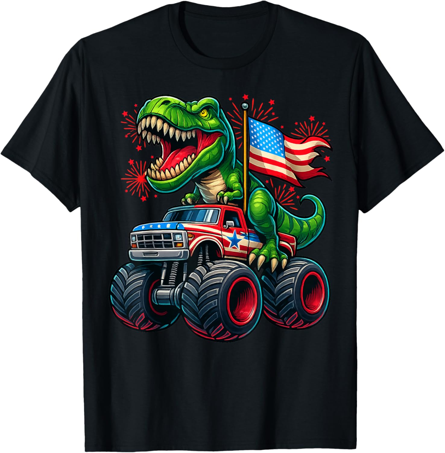 4th Of July T-Rex Dinosaur Monster Truck USA Flag Boys Men T-Shirt