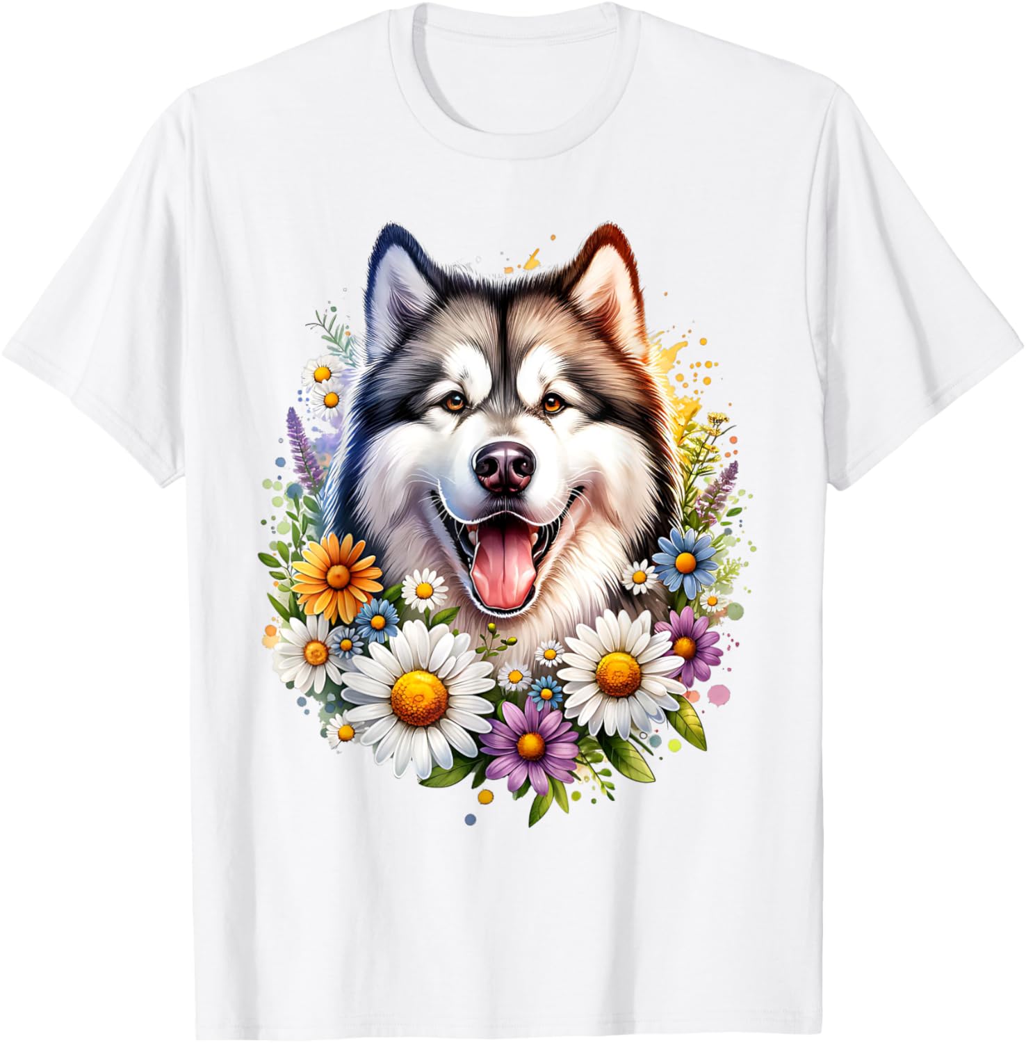 Alaskan Malamute Dog Summer Daisy Wildflowers Artwork T-Shirt