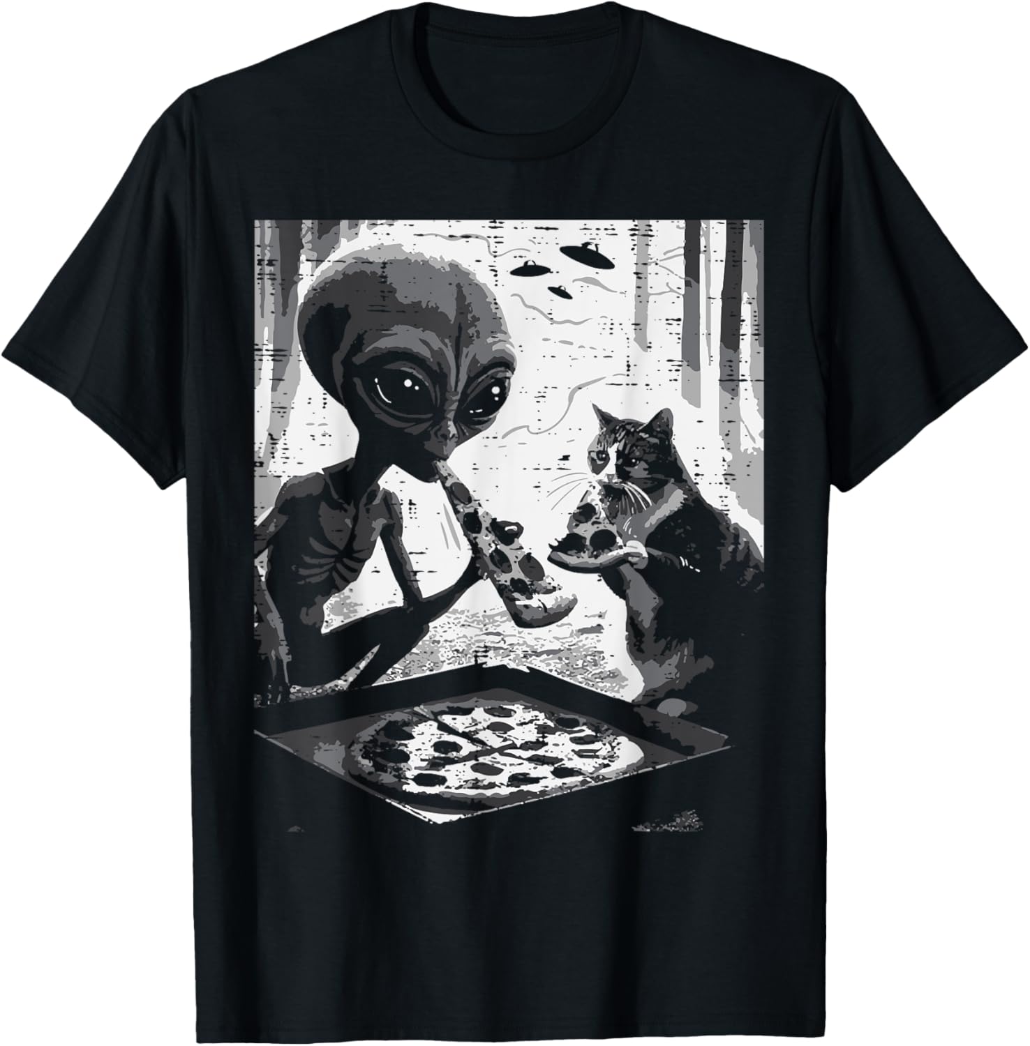 Alien And Cat Eating Pizza Funny Snack Food Men Women Kids T-Shirt