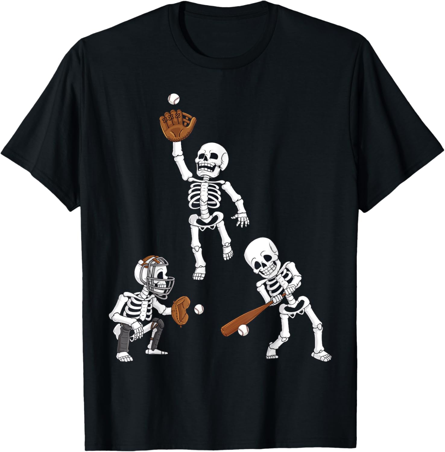 Baseball Halloween Skeletons Hitter Catcher Boys Kids Teen T-Shirt