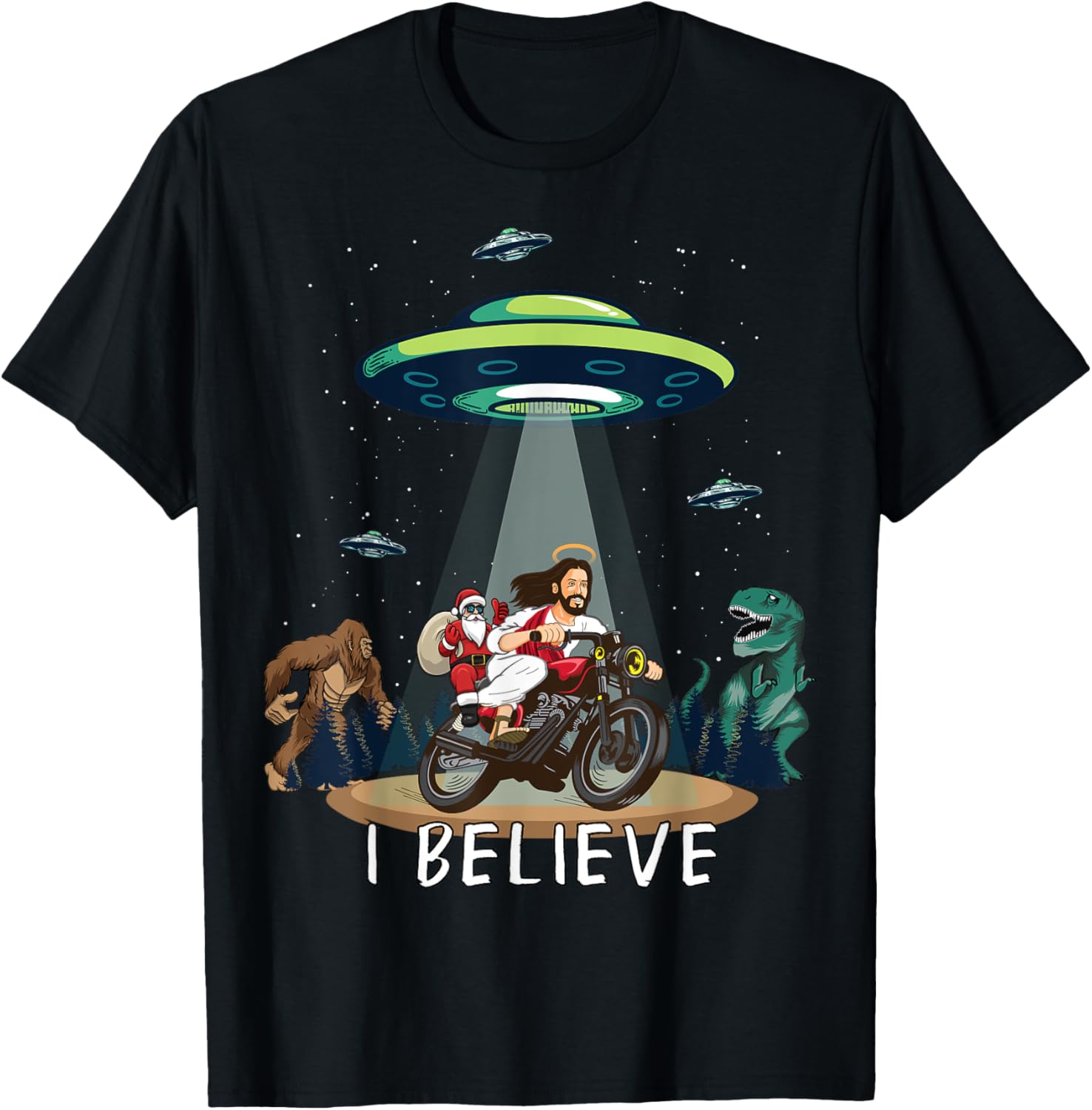 Believe Bigfoot Dinosaur Santa & Jesus Riding Bike Christmas T-Shirt