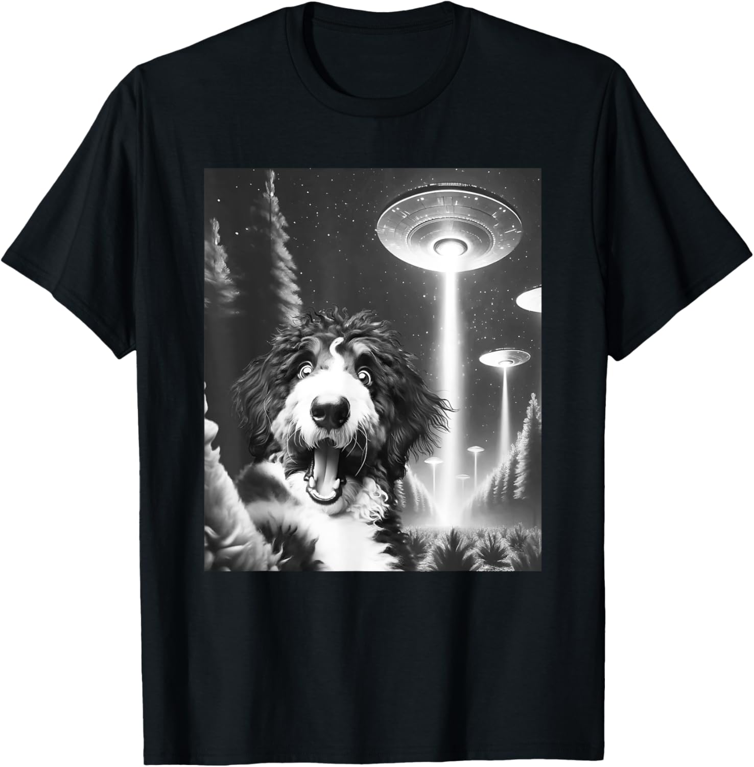 Funny Bernedoodle Alien UFO Taking a Selfie Dog Mom Dad T-Shirt