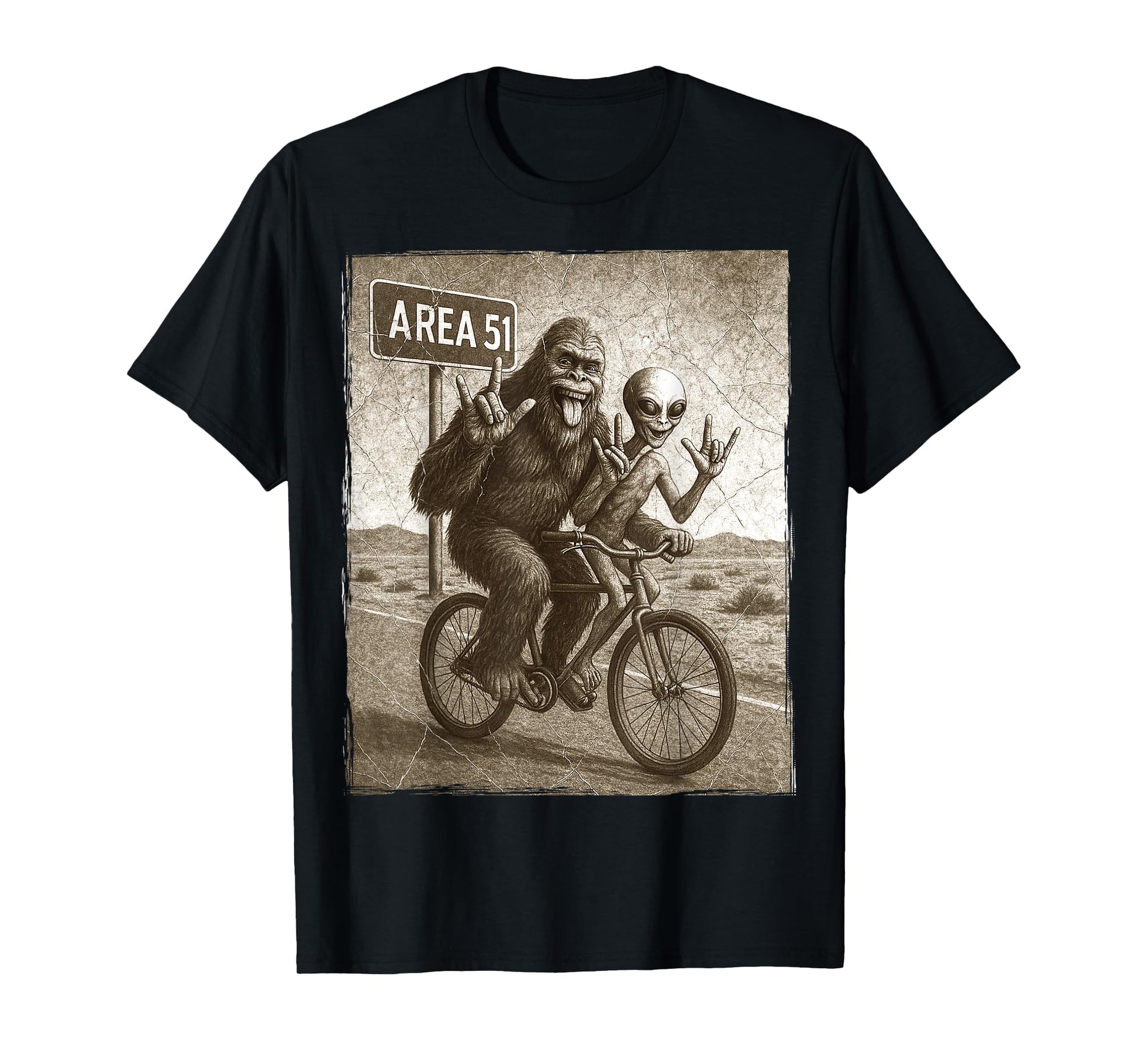 Bigfoot Alien UFO Bike Ride Rock On Area 51 Vintage Funny T-Shirt