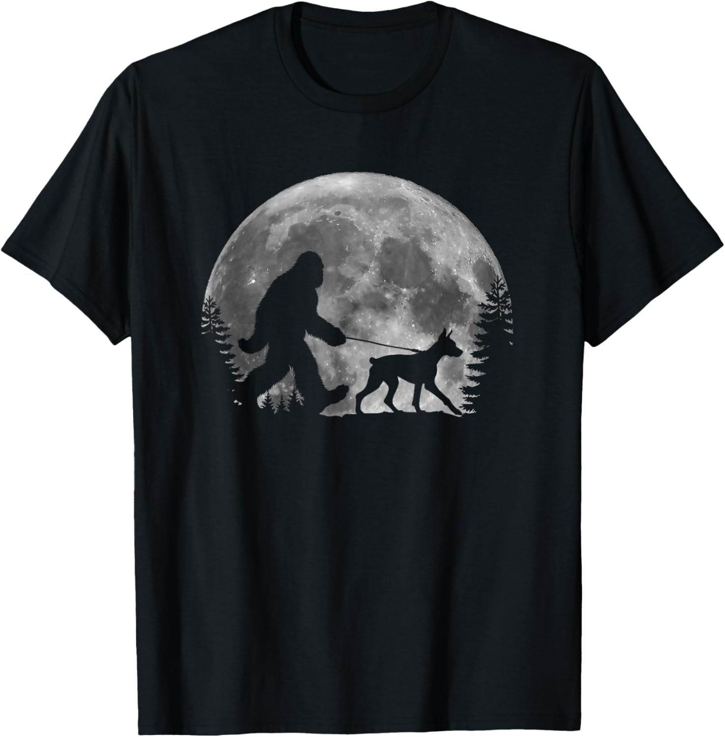 Bigfoot Walking a Dog Funny Doberman Pinscher Moon Halloween T-Shirt