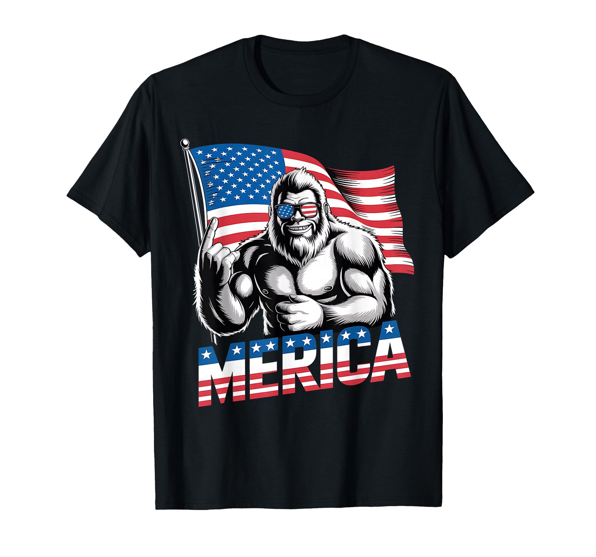 Bigfoot Merica Rock 4th of July Funny Patriotic USA Flag T-Shirt
