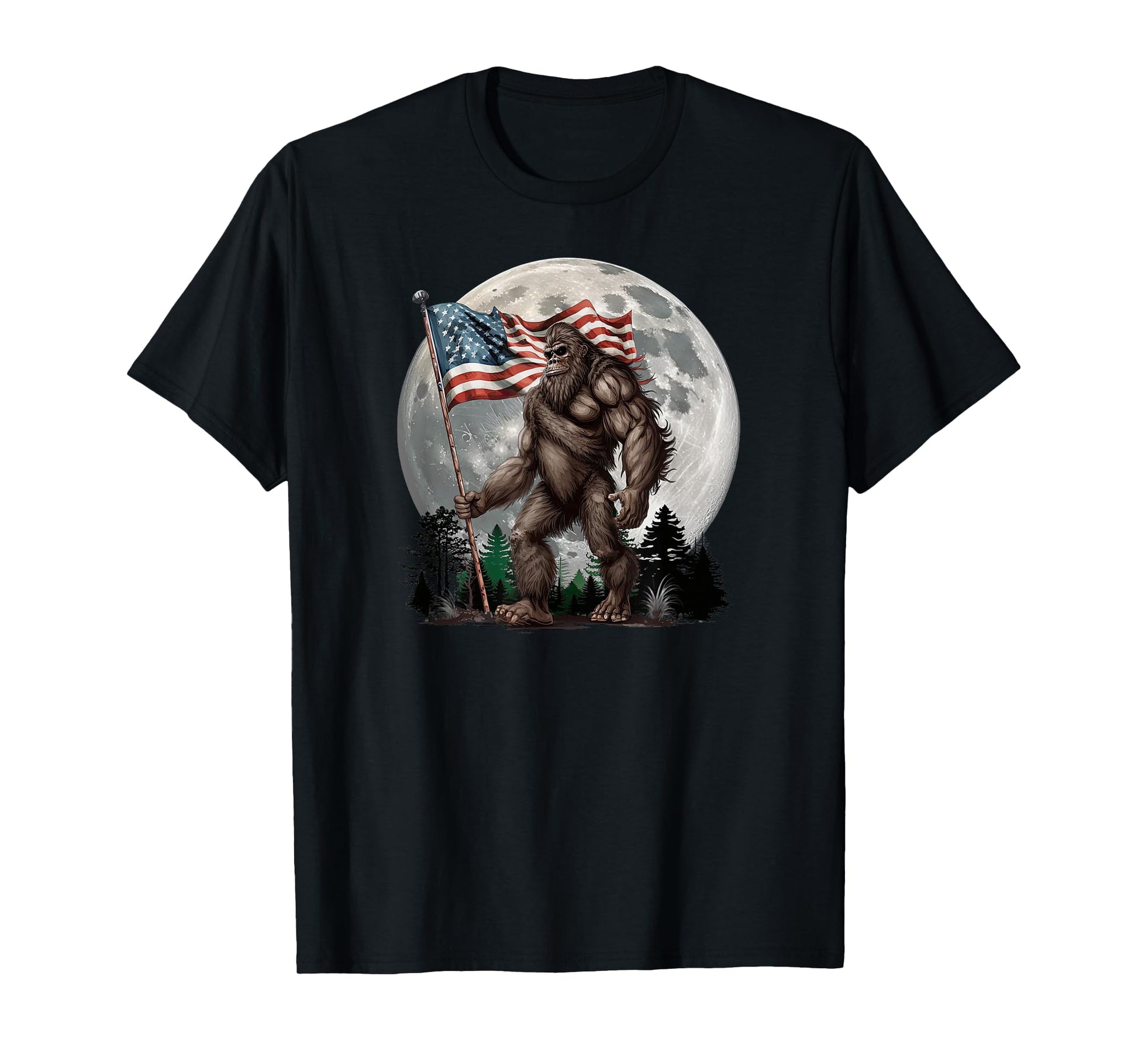 Bigfoot Sasquatch - American Flag Full Moon Patriotic T-Shirt