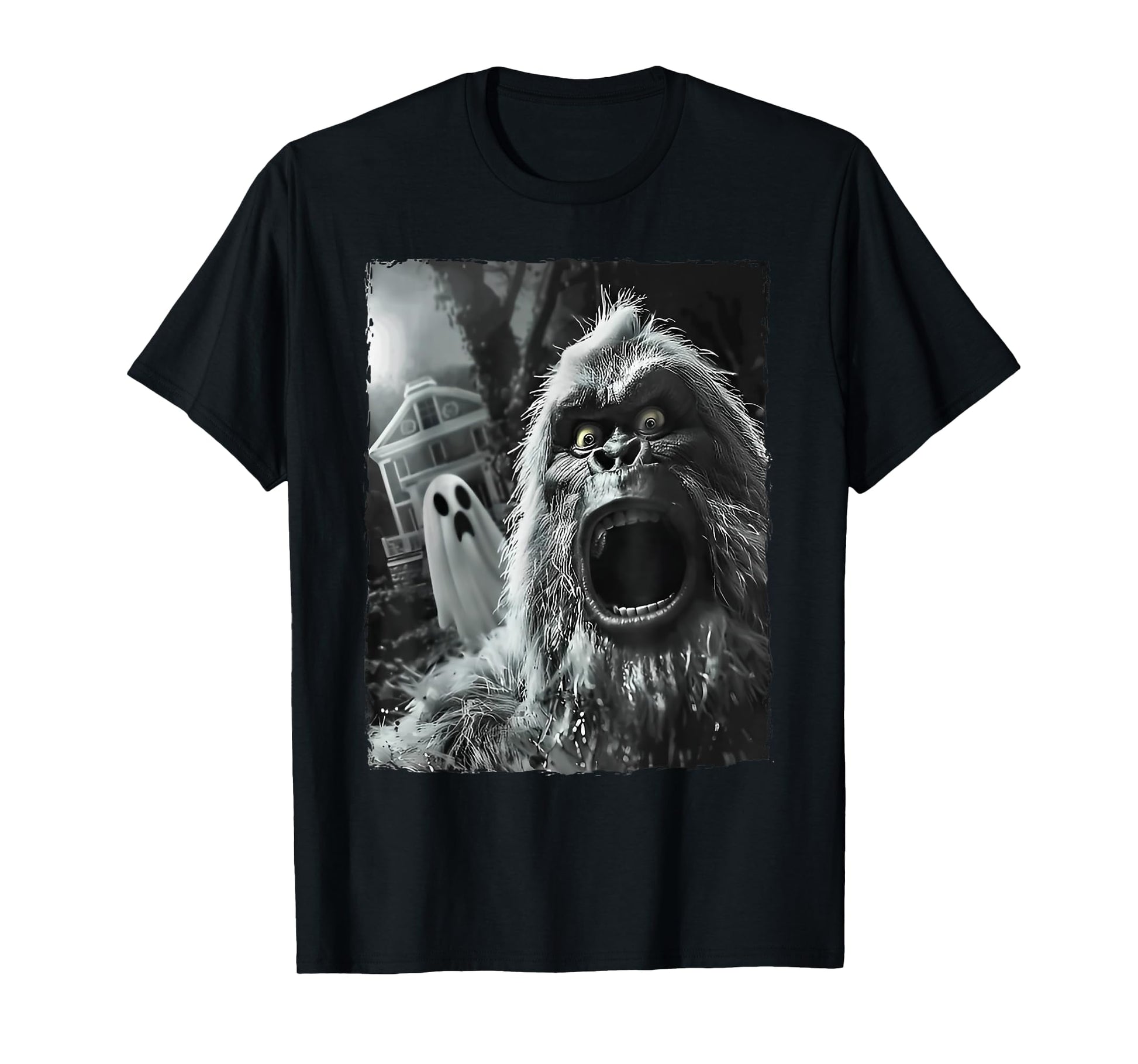 bigfoot sasquatch selfie with ghost halloween haunted house T-Shirt