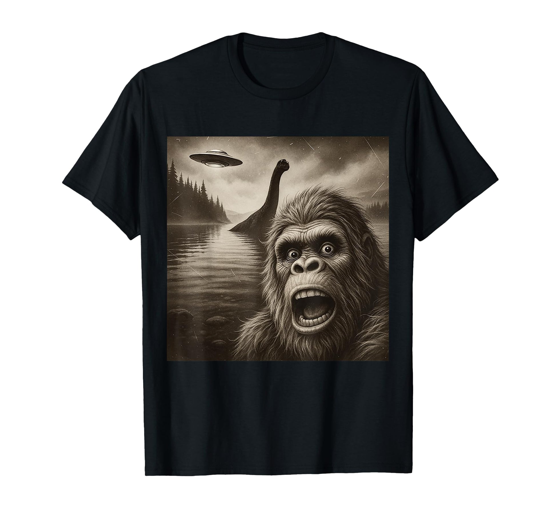 Bigfoot Selfie With Loch Ness Monster And UFO Aliens Graphic T-Shirt