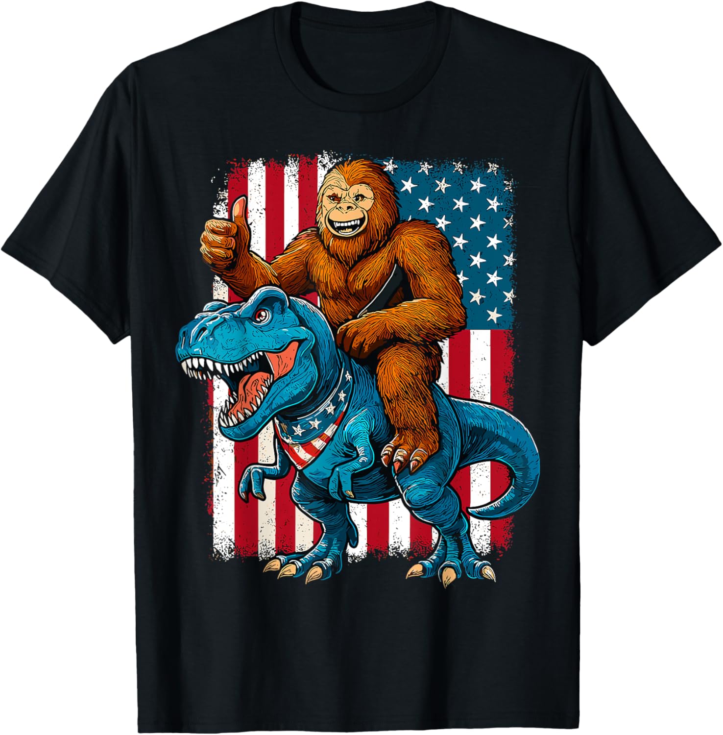 Bigfoot T Rex Dinosaur 4th of July Funny Patriotic USA Flag T-Shirt
