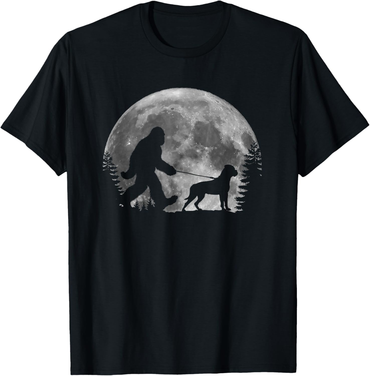 Bigfoot Walking a Dog Funny Bull Mastiff Moon Halloween T-Shirt
