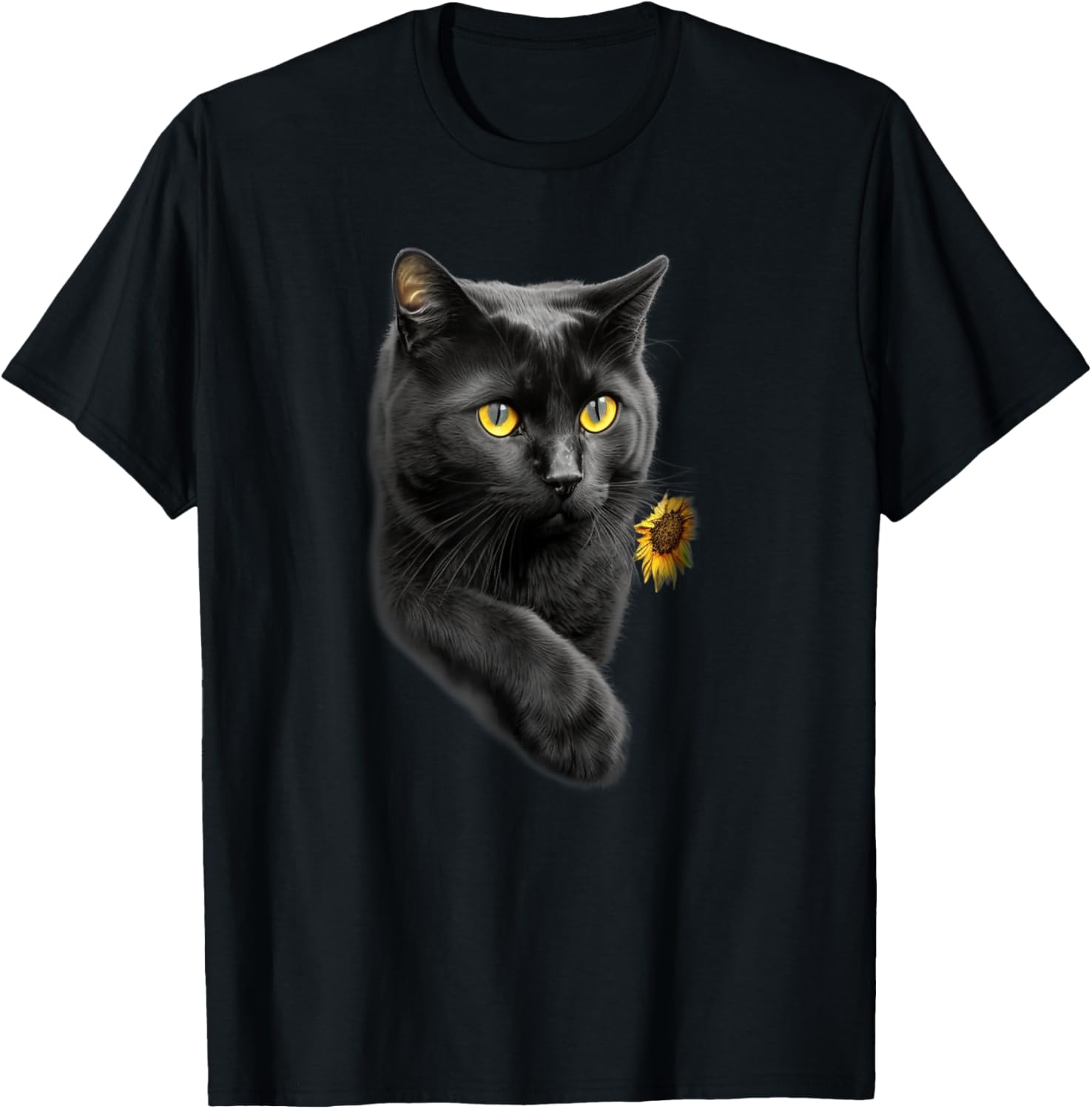 Cute Black Cat with Yellow Eyes and sunflower cats lover T-Shirt