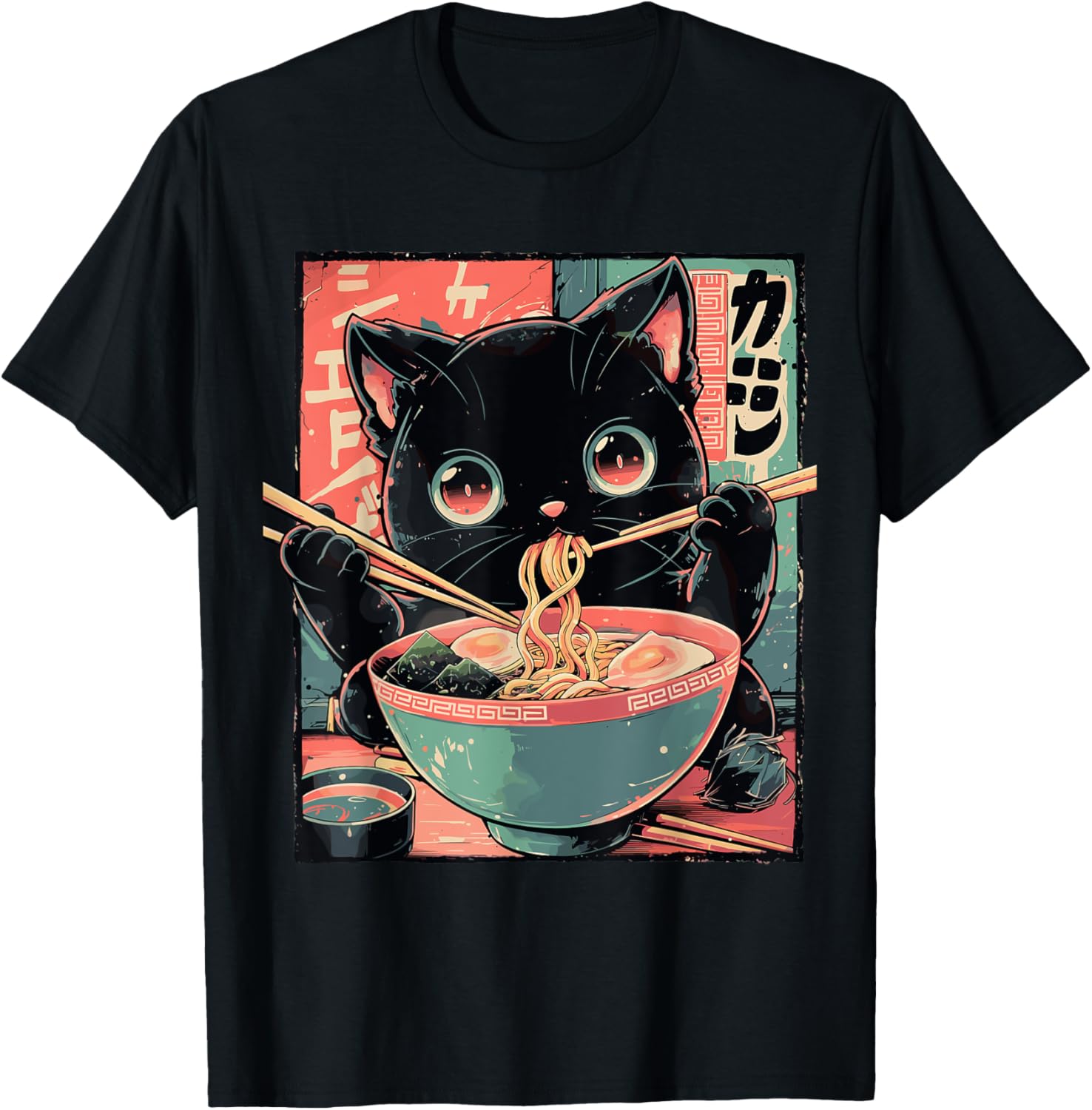Cute Cat Eating Ramen Anime Japanese Culture T-Shirt