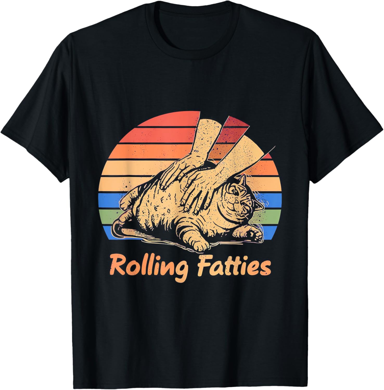 Cat Rolling Fatties Funny T-Shirt - Unisex Adults, Black, Small, Short Sleeve, T-Shirt, Cartoon, Humorous, Modern Cartoon