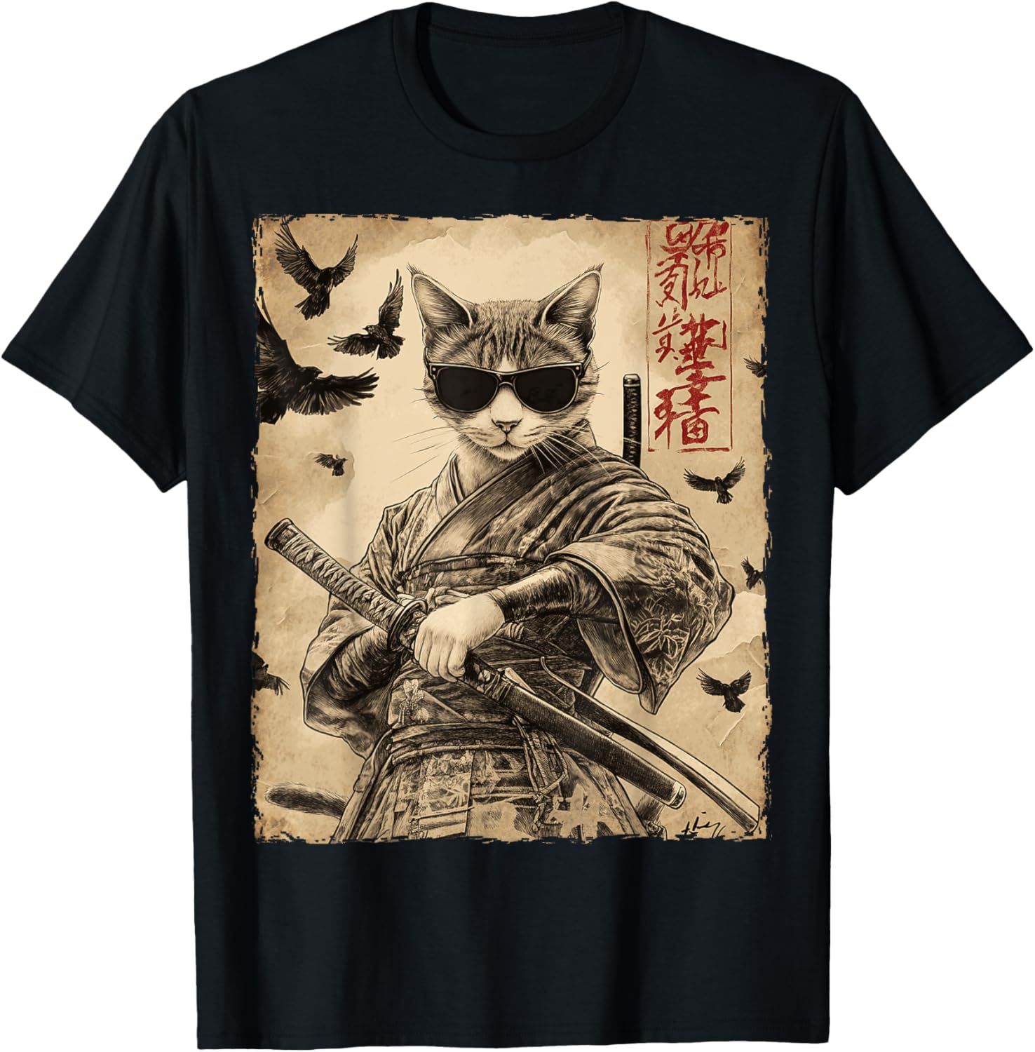 Cat Samurai Sunglasses Japanese Warrior Anime T-Shirt