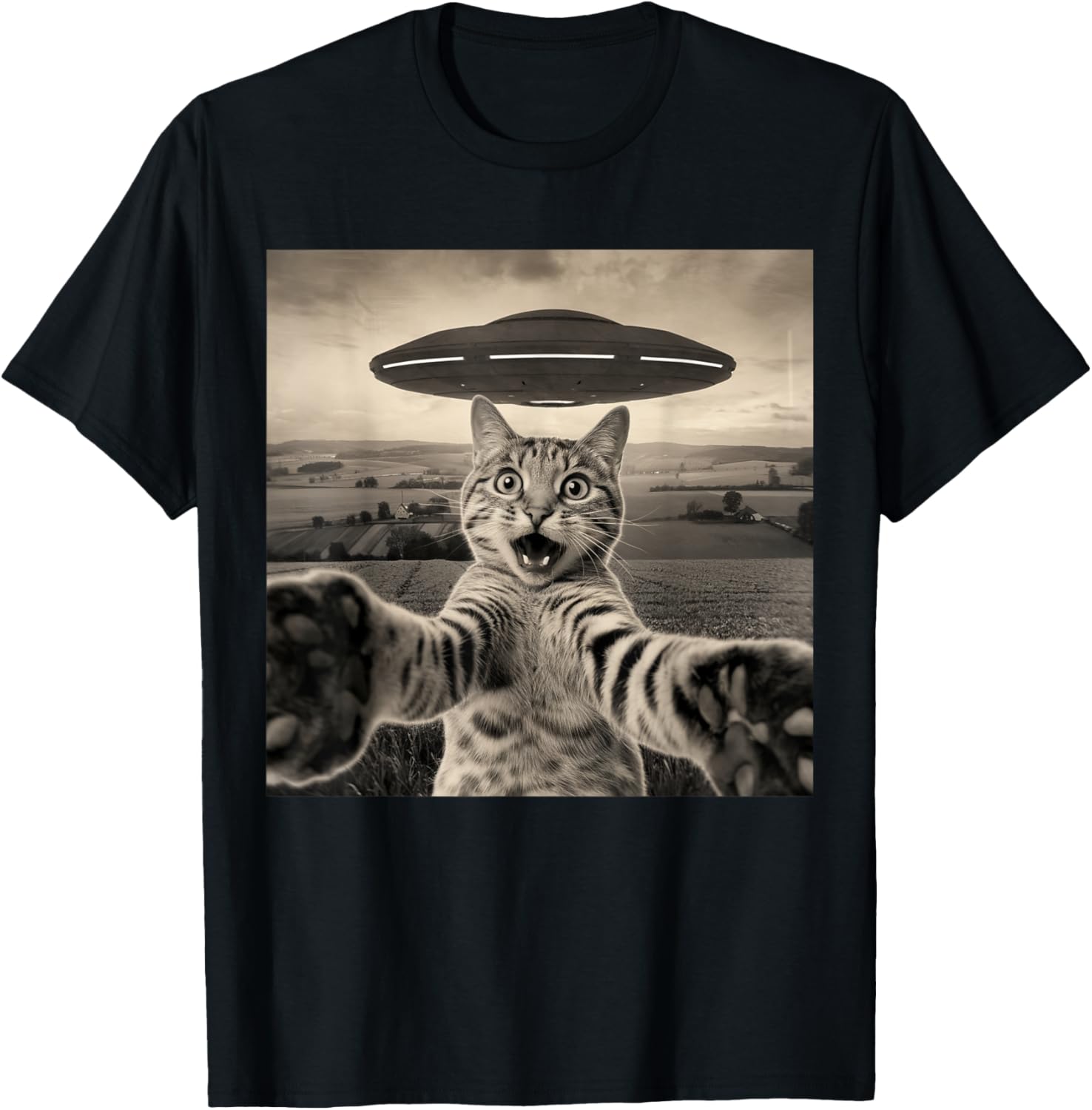 Cat Selfie With Alien UFOs Funny Cat Sarcastic Humor Meme T-Shirt