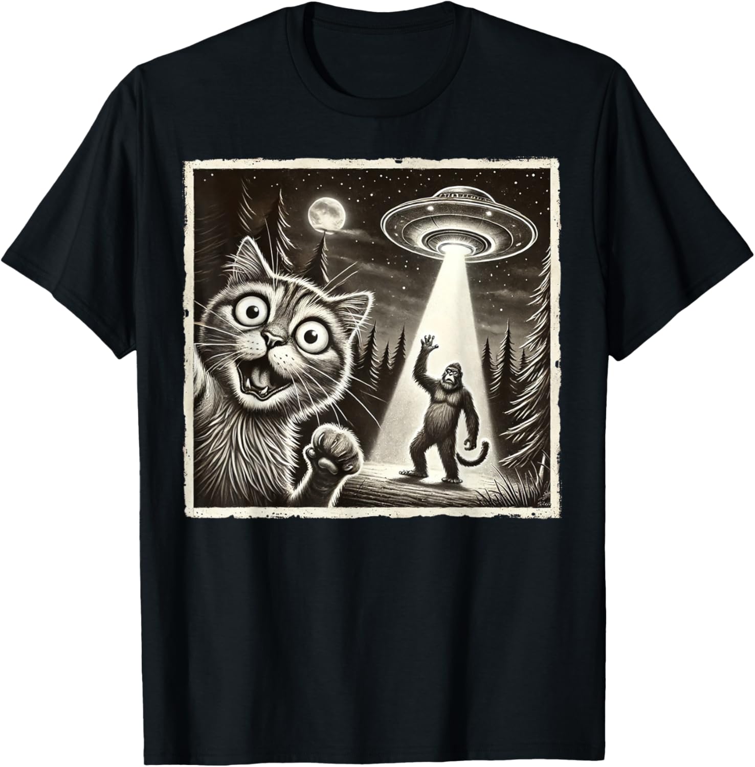 Cat Selfie With Bigfoot UFO Funny Cat Sasquatch Lover T-Shirt