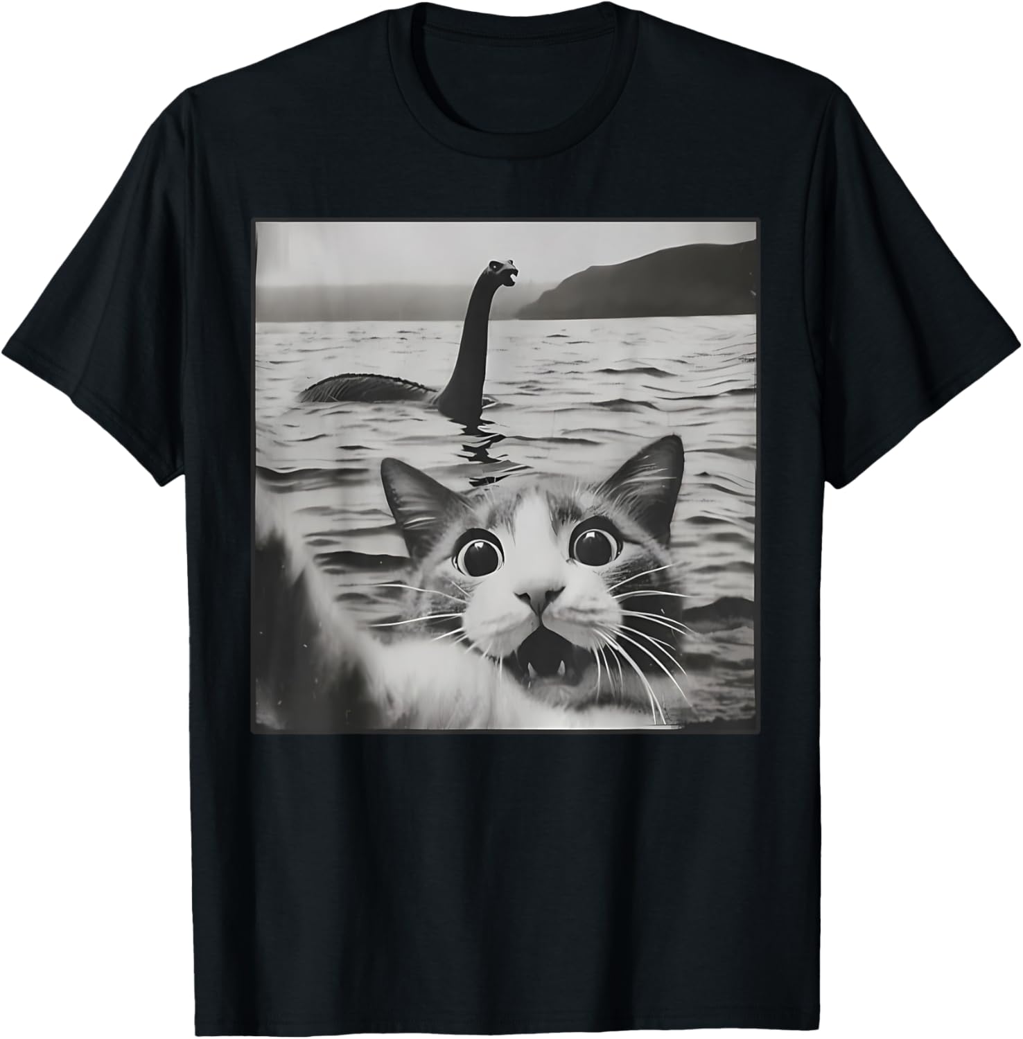 Cat Selfie With Loch Ness Monster Funny Cats Men Women Kids T-Shirt