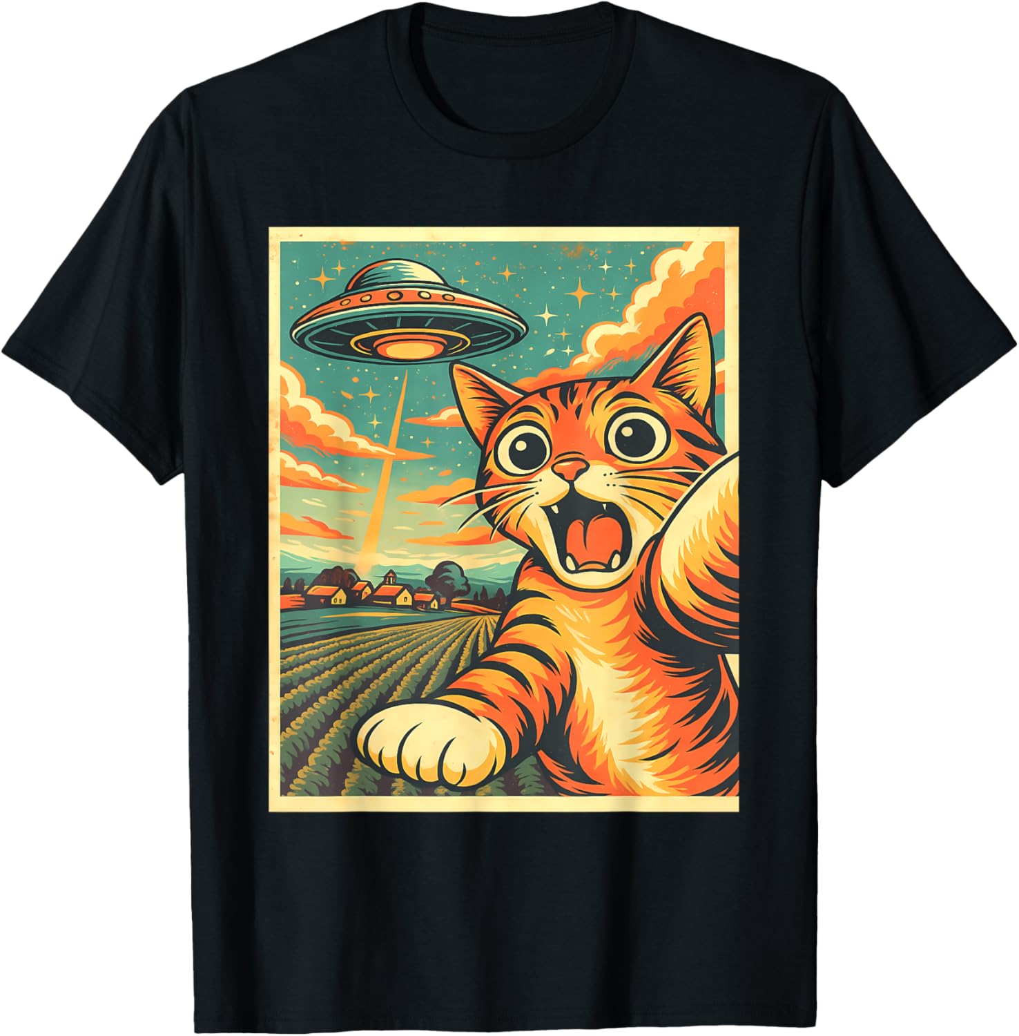 Cat Selfie With Alien UFO Tulip Funny Anime Kawaii Graphic T-Shirt