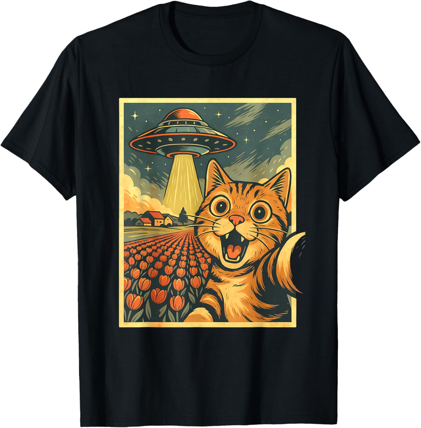 Cat Selfie With Alien UFO Tulip Funny Anime Kawaii Graphic T-Shirt