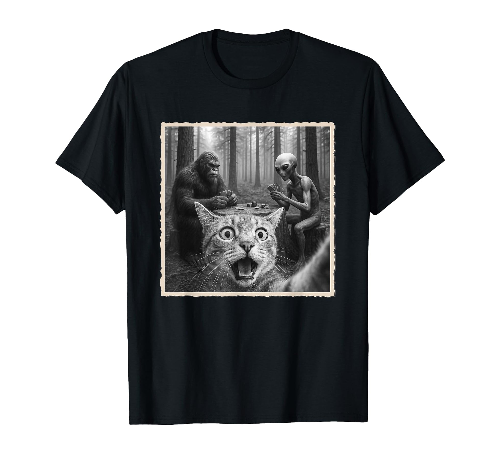 Cat Selfie With Bigfoot & Alien | Funny Scared Cat T-Shirt
