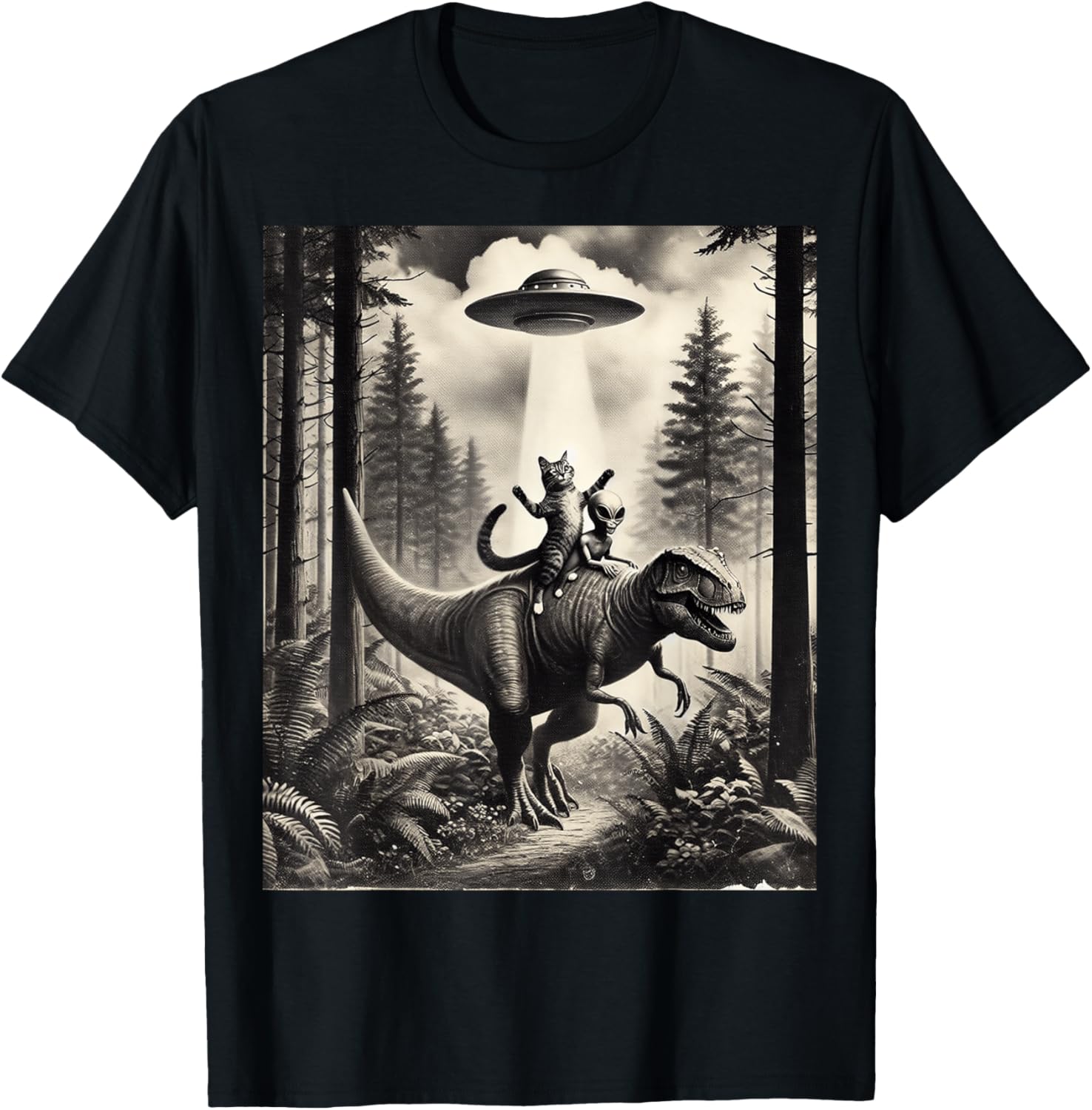 Cat With Alien Riding Dinosaur T-Rex. Cat And UFO Spaceship Men Women Girls Kids T-Shirt