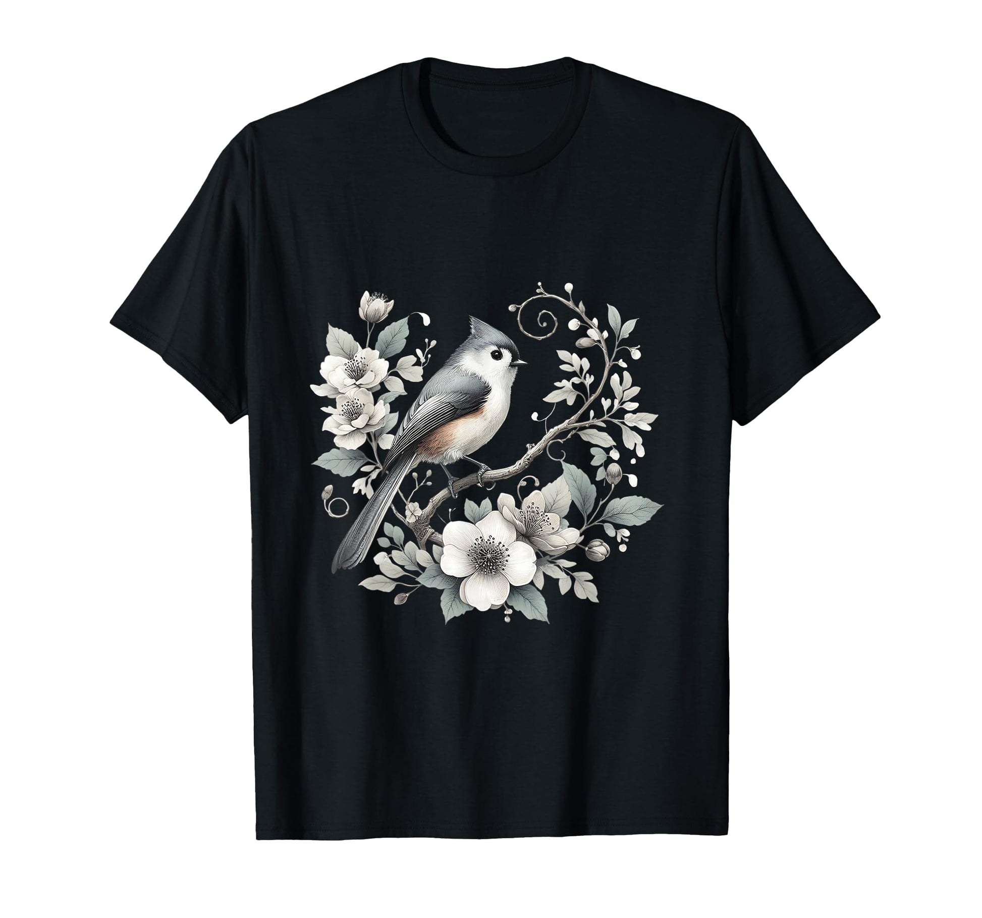Charming Tufted Titmouse Bird with Floral Nature Design T-Shirt