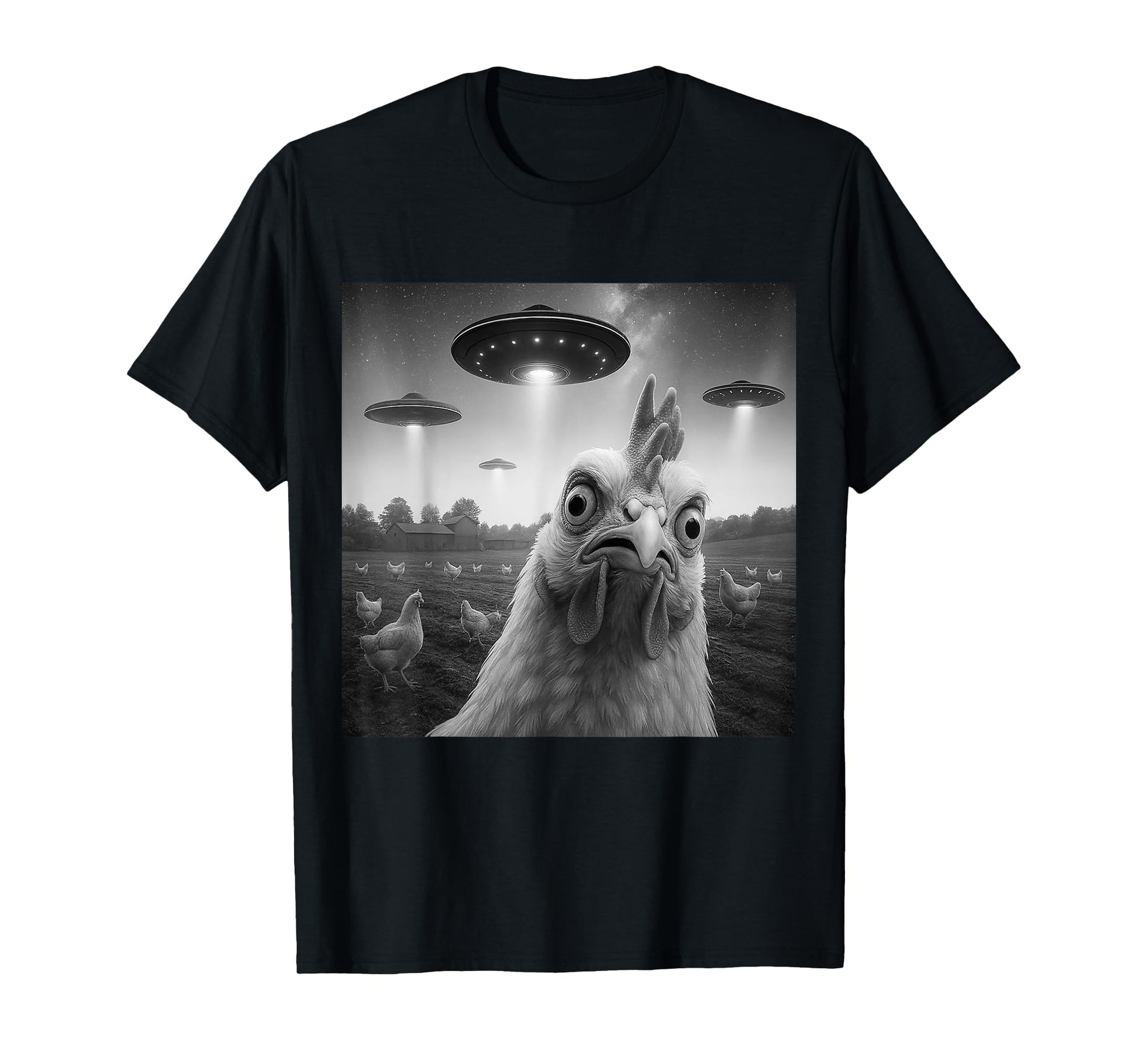 Chicken Rooster Funny Selfie Chicken with UFOs Weird Aliens T-Shirt