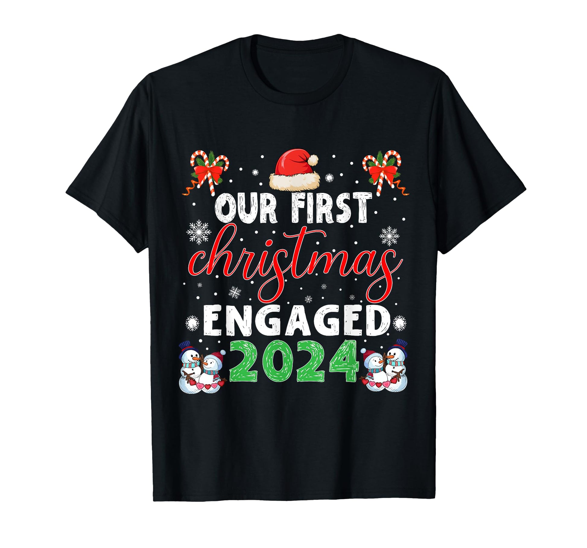 Christmas Couple tees Our First Christmas Engaged 2024 Funny Couple Xmas Pajamas T-Shirt