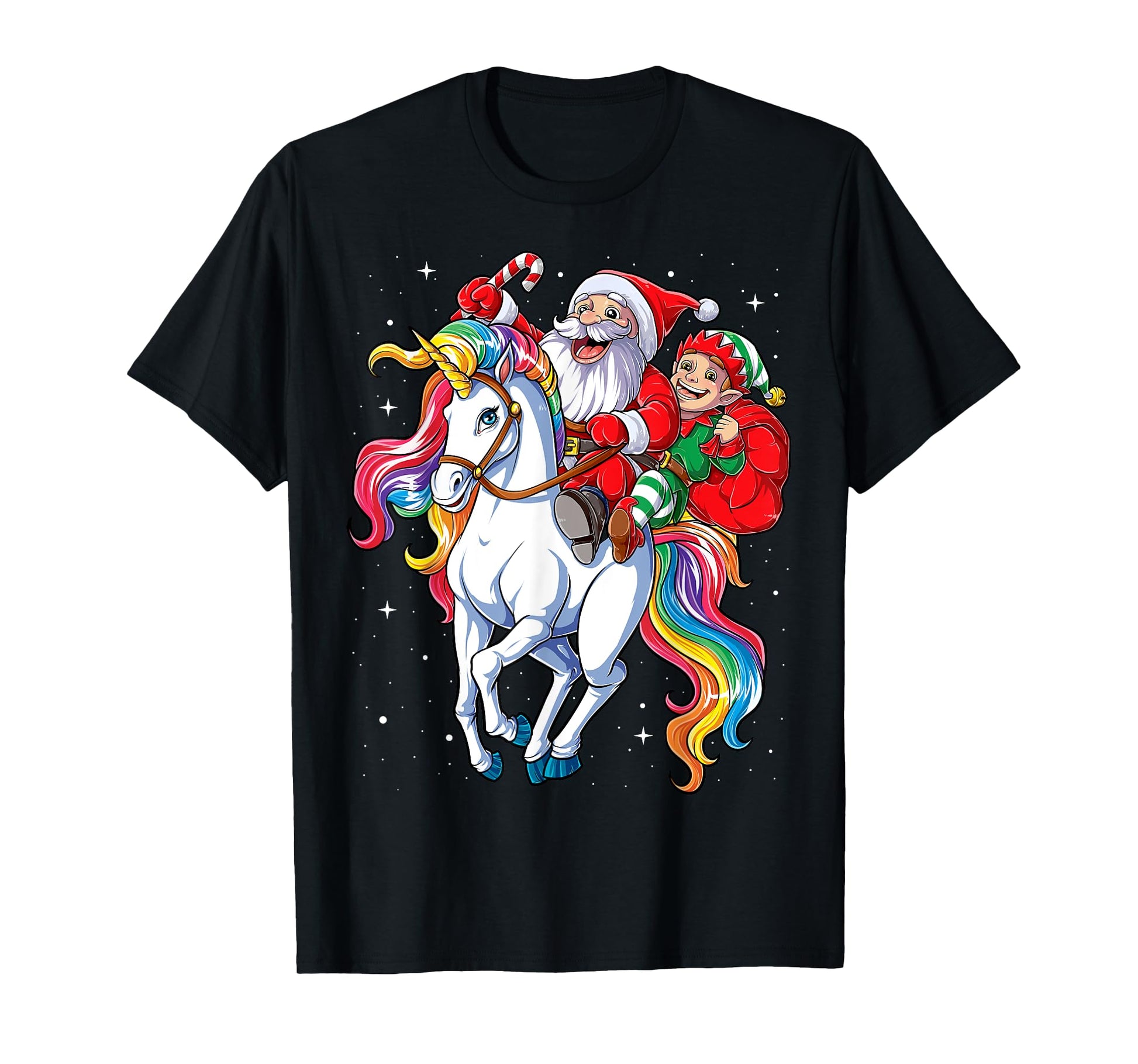 Christmas Santa Elf Riding Unicorn Xmas Girls Women Rainbow T-Shirt