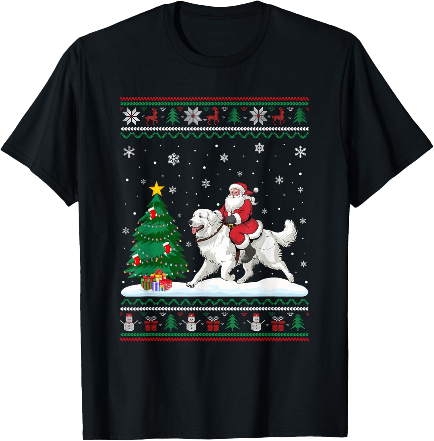 Ugly Christmas Tree Lights Santa Riding Great Pyrenees Dog T-Shirt