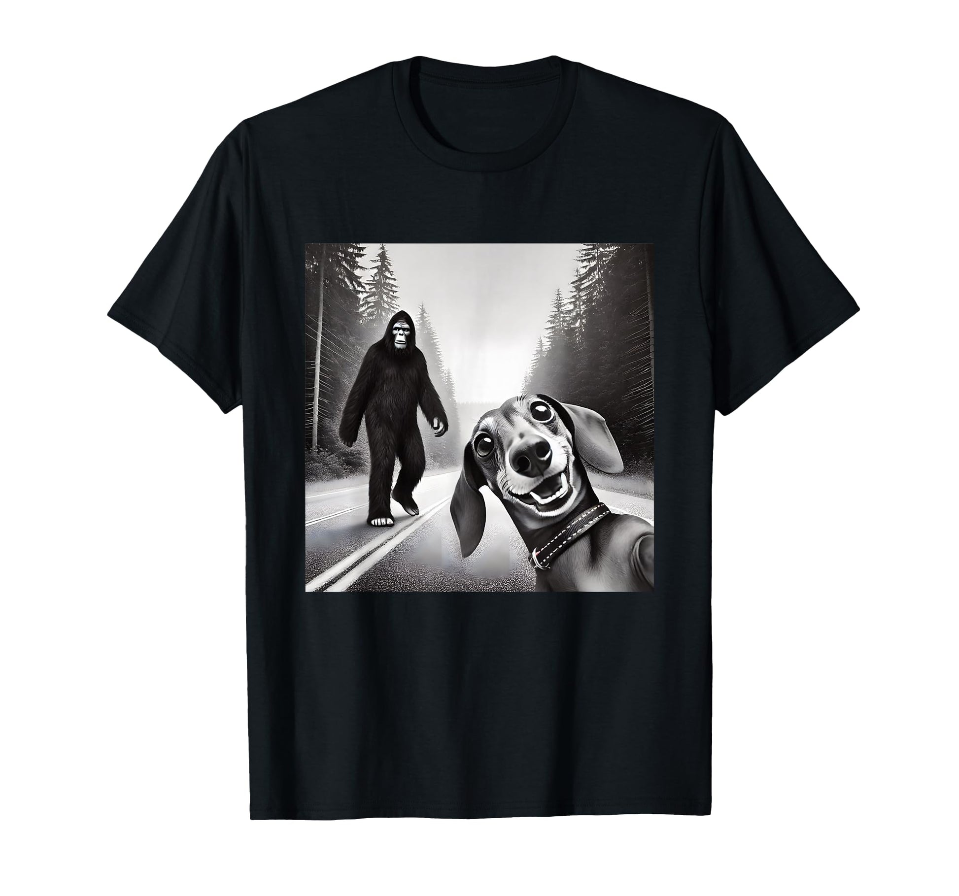 Comical Dachshund Encounters Mythical Creatures Unisex T-Shirt - Bigfoot And Dachshund On Road - Black - Small - Short Sleeve