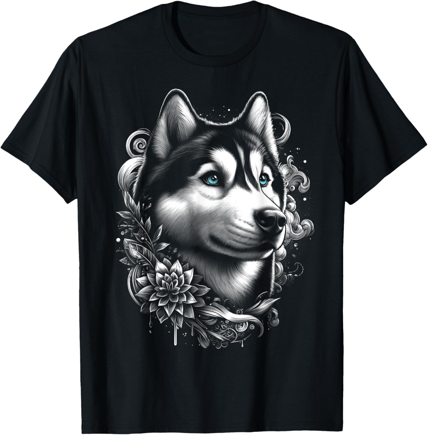 Cool Husky with Blue Eyes and Flowers Decoration T-Shirt