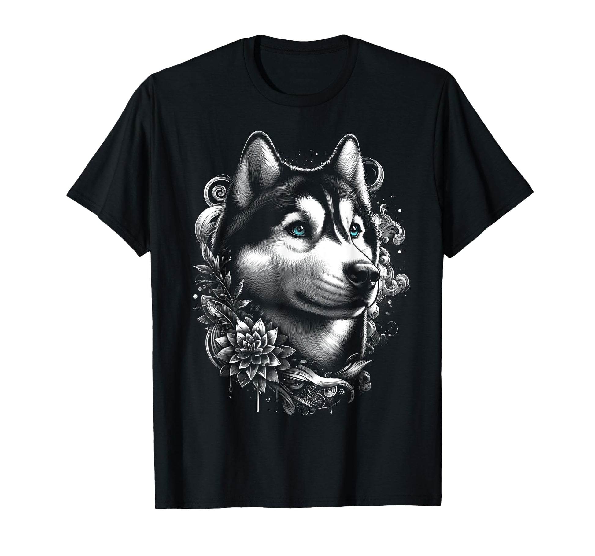 Cool Husky with Blue Eyes and Flowers Decoration T-Shirt