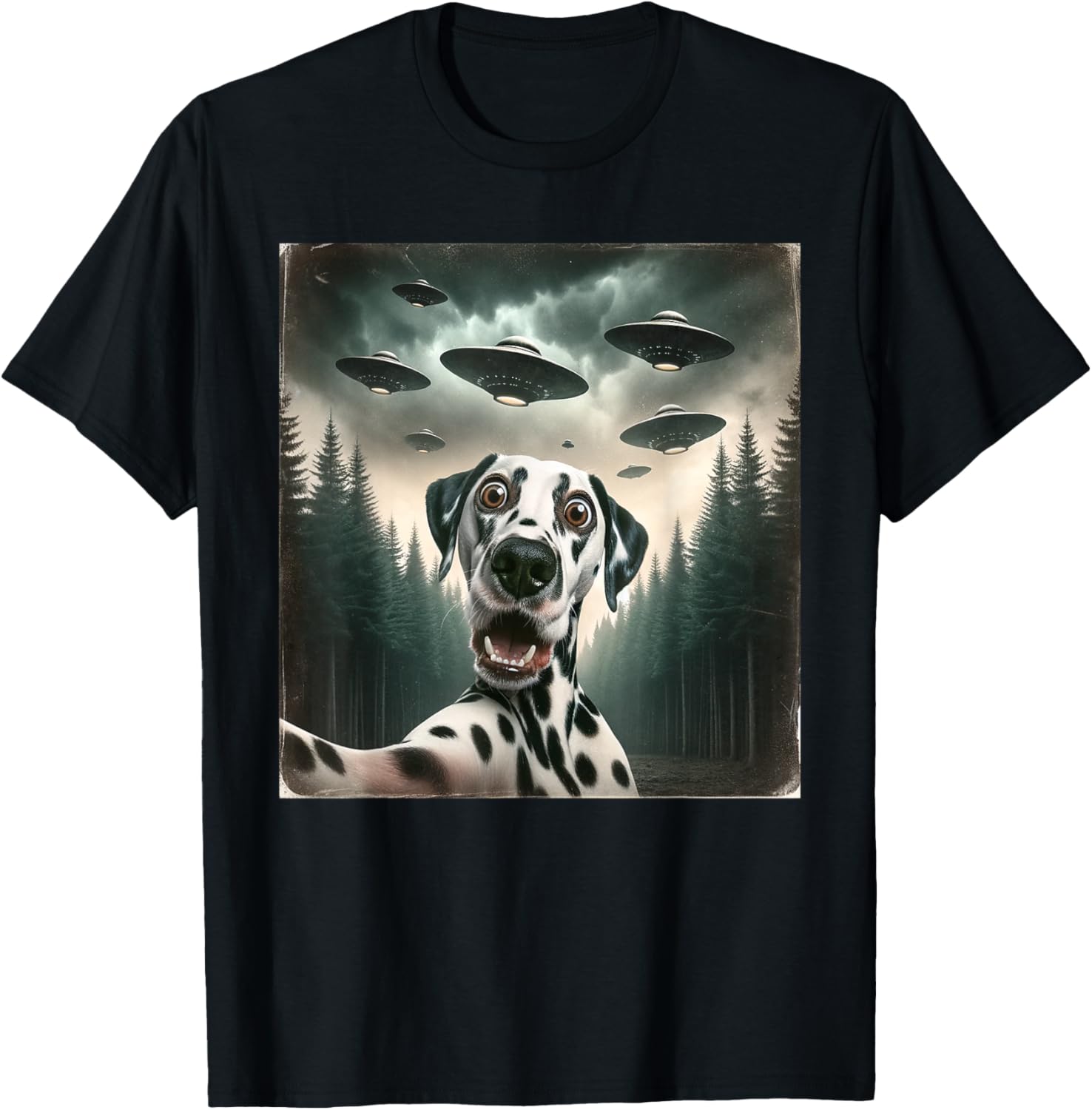 Funny Dalmatian Selfie with UFOs Alien Mens Womens Dog T-Shirt