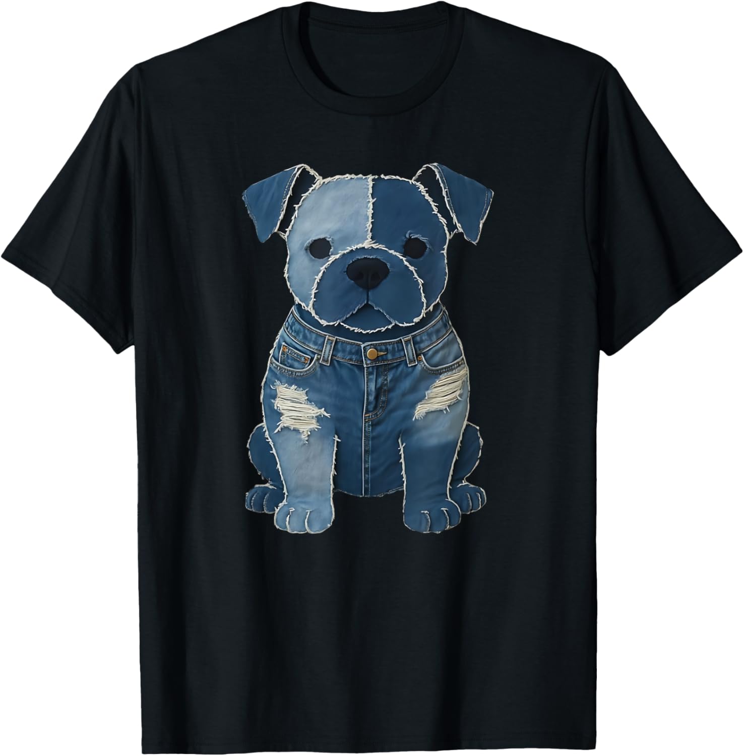 Funny Denim Patch Animal Dog Print Patchwork Art T-Shirt