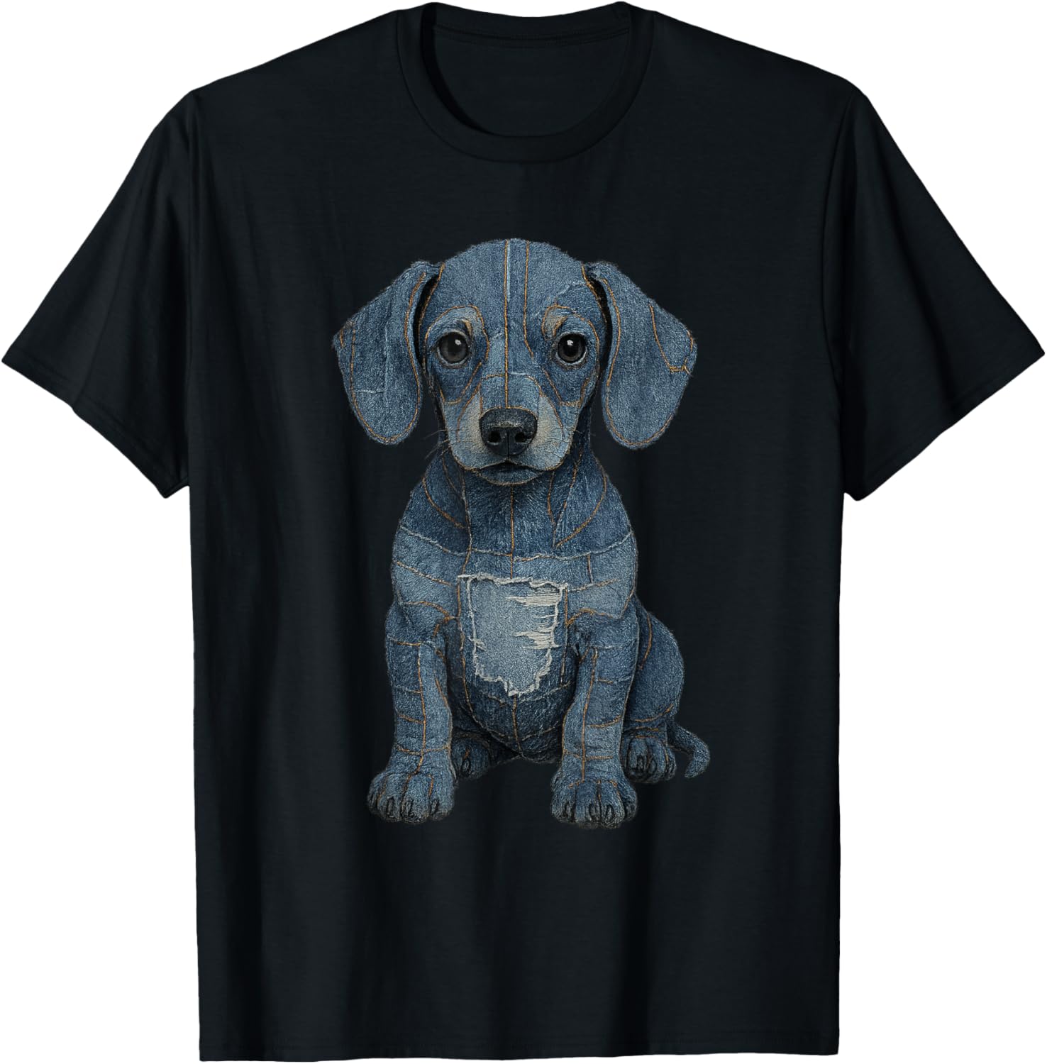 Retro Funny Denim Patch Animal Dog Print Dachshund T-Shirt