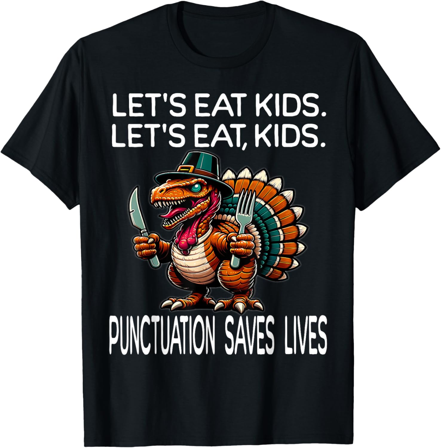 Dino Teacher Grammar Thanksgiving Dinosaur Gifts Funny Thanksgiving Teacher Turkey Lets Eat Kids Punctuation T-Shirt