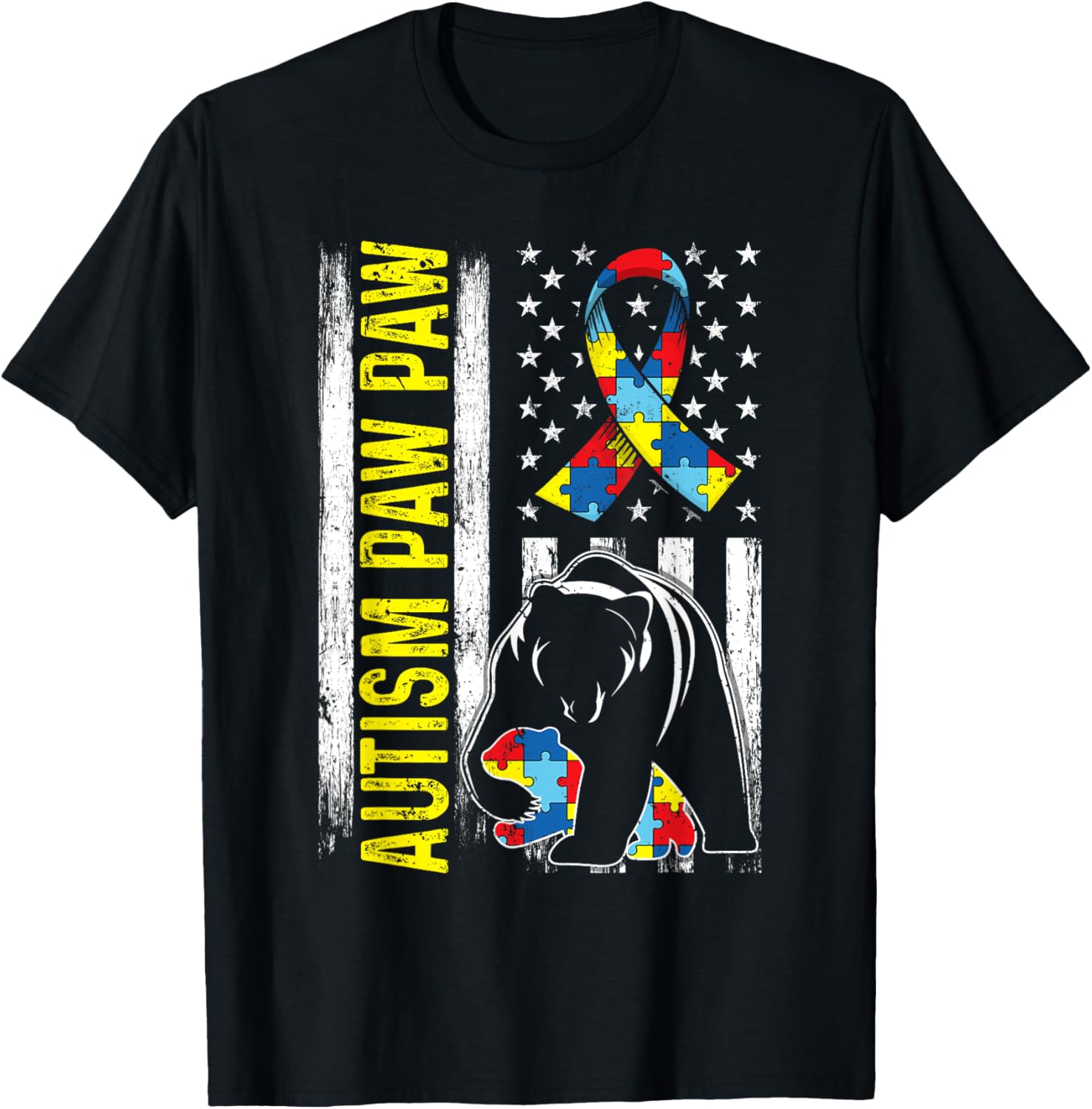 Distressed American Flag Autism Paw Paw Bear Awareness T-Shirt for Women Kids Men