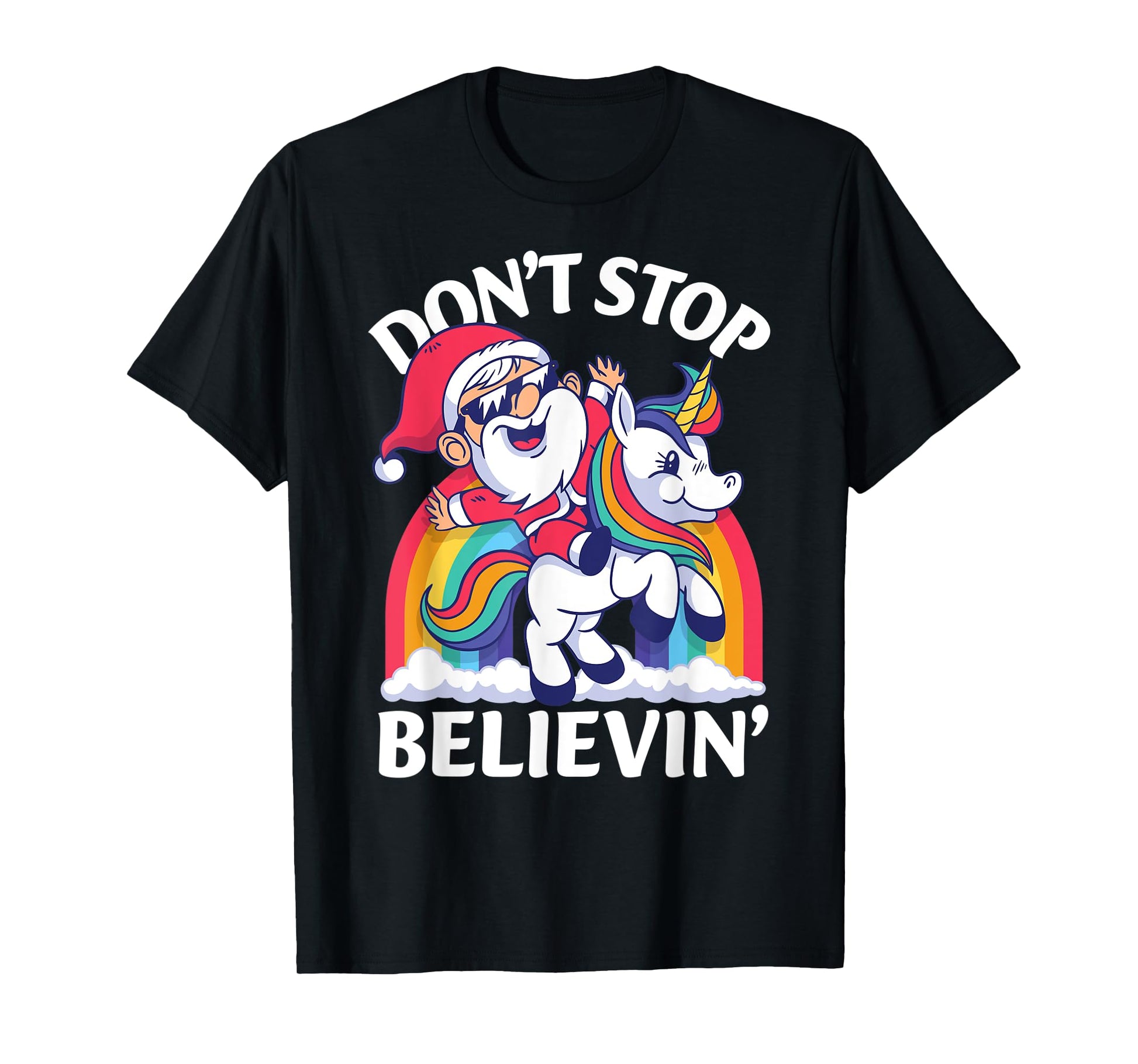 Don't Stop Believin Santa Riding Unicorn Christmas Rainbow T-Shirt
