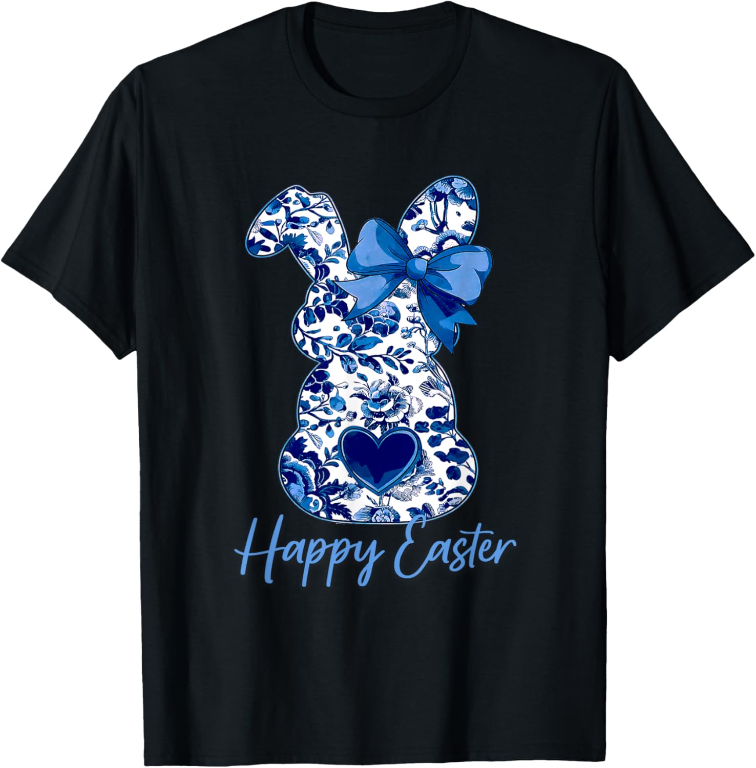 Easter Chinoiserie Floral Bunny With Cute Blue Bow Coquette T-Shirt