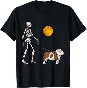 English Bulldog Skeleton Dog Walking Halloween Costume T-Shirt