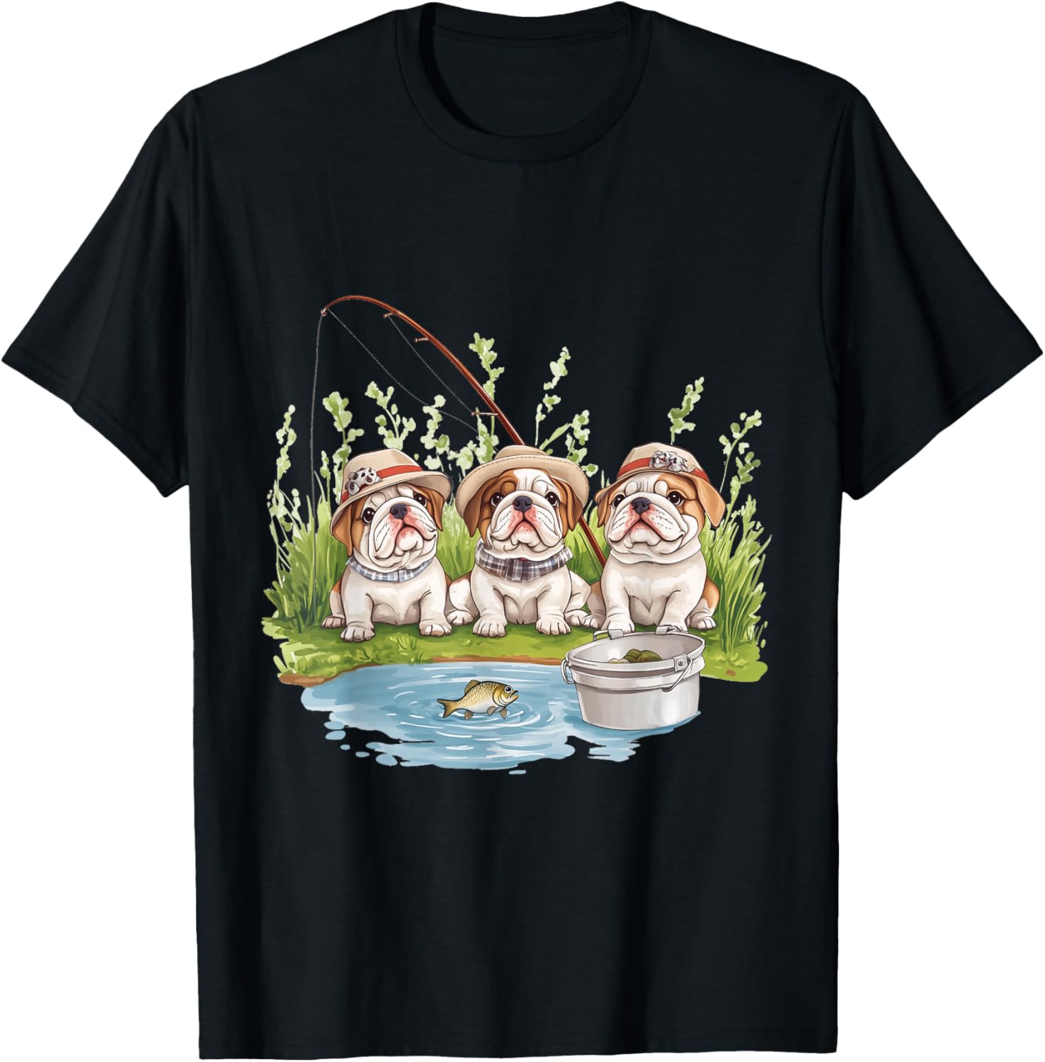 Cute English Bulldogs Fishing Pond Puppy Lake Fish Dogs T-Shirt