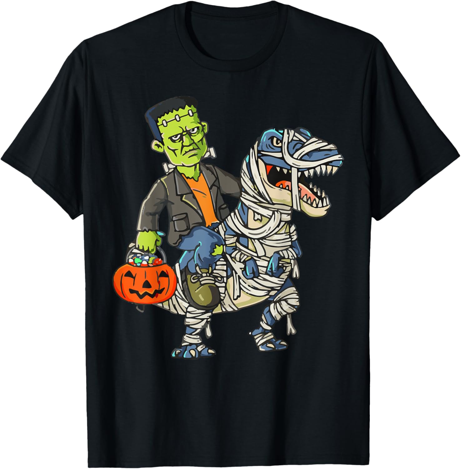 Frankenstein Riding Mummy Dinosaur Funny Halloween T-Shirt