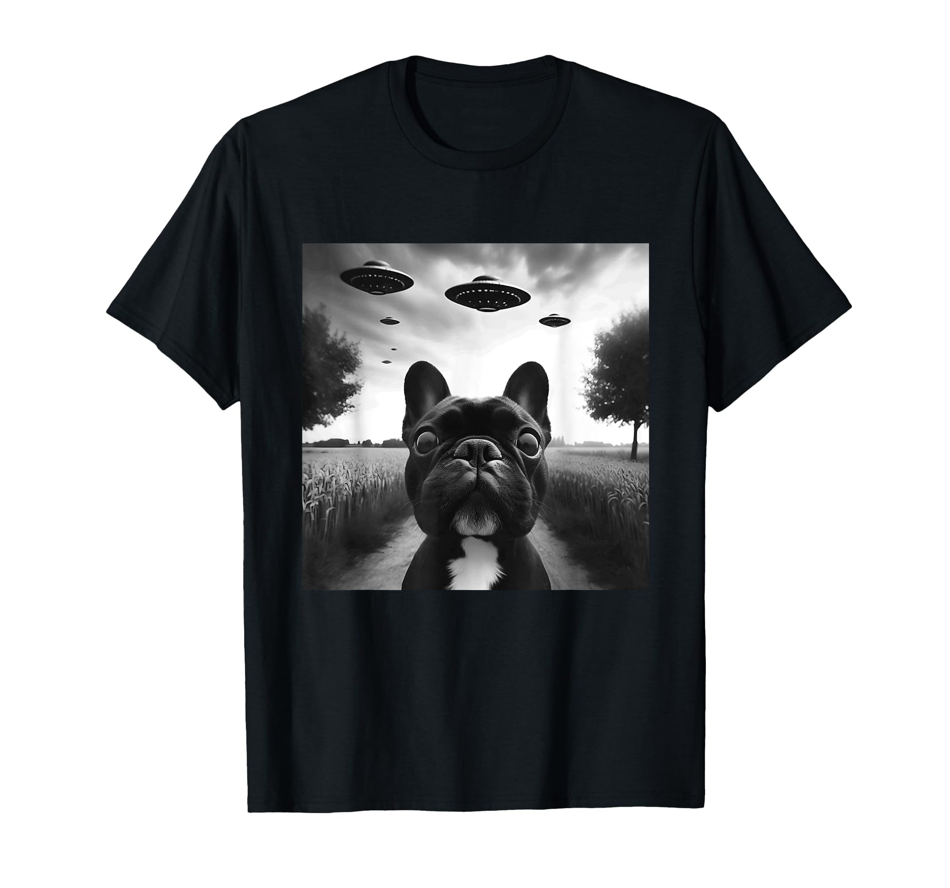 French Bulldog Funny Graphic Selfie with UFOs Weird Aliens T-Shirt