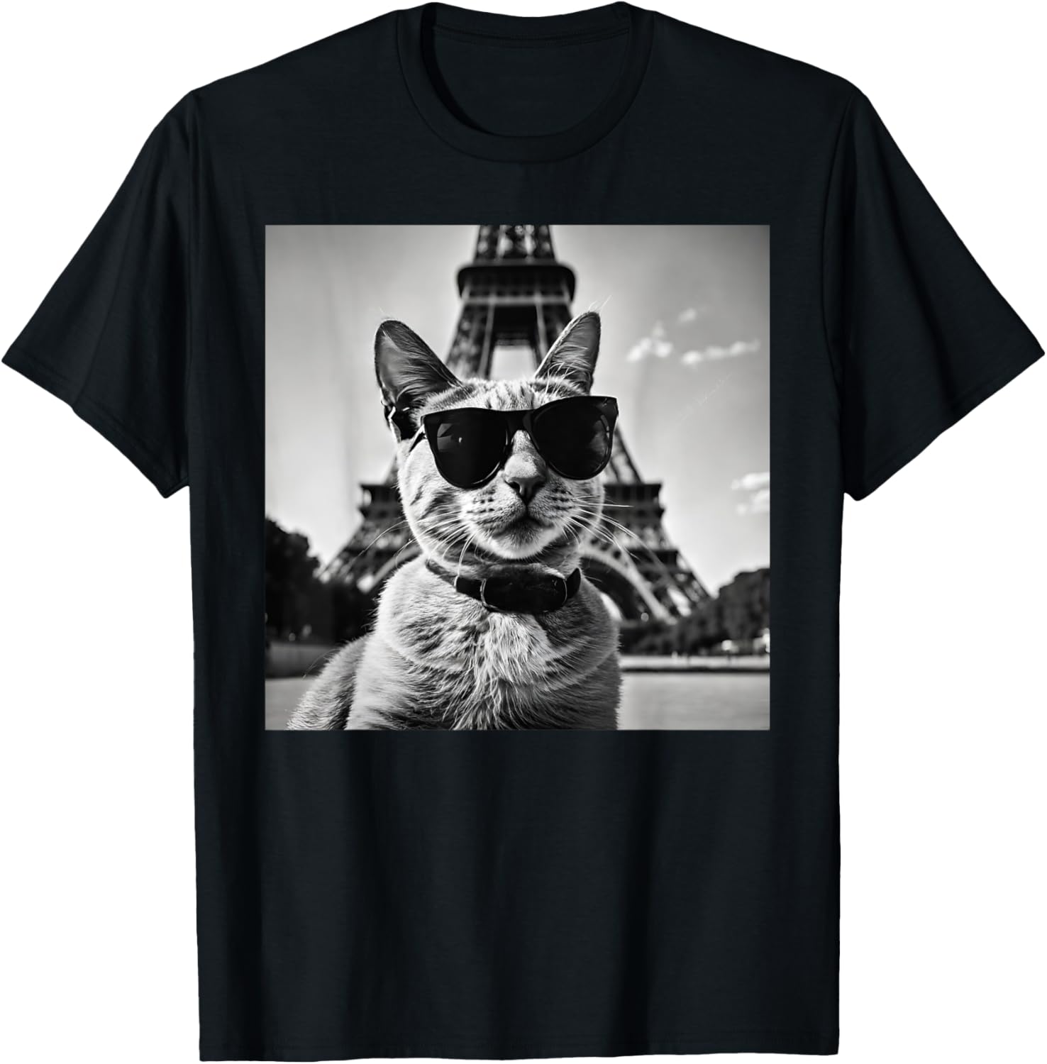 Funny French Cat Wearing Sunglasses And Paris Eiffel Tower T-Shirt