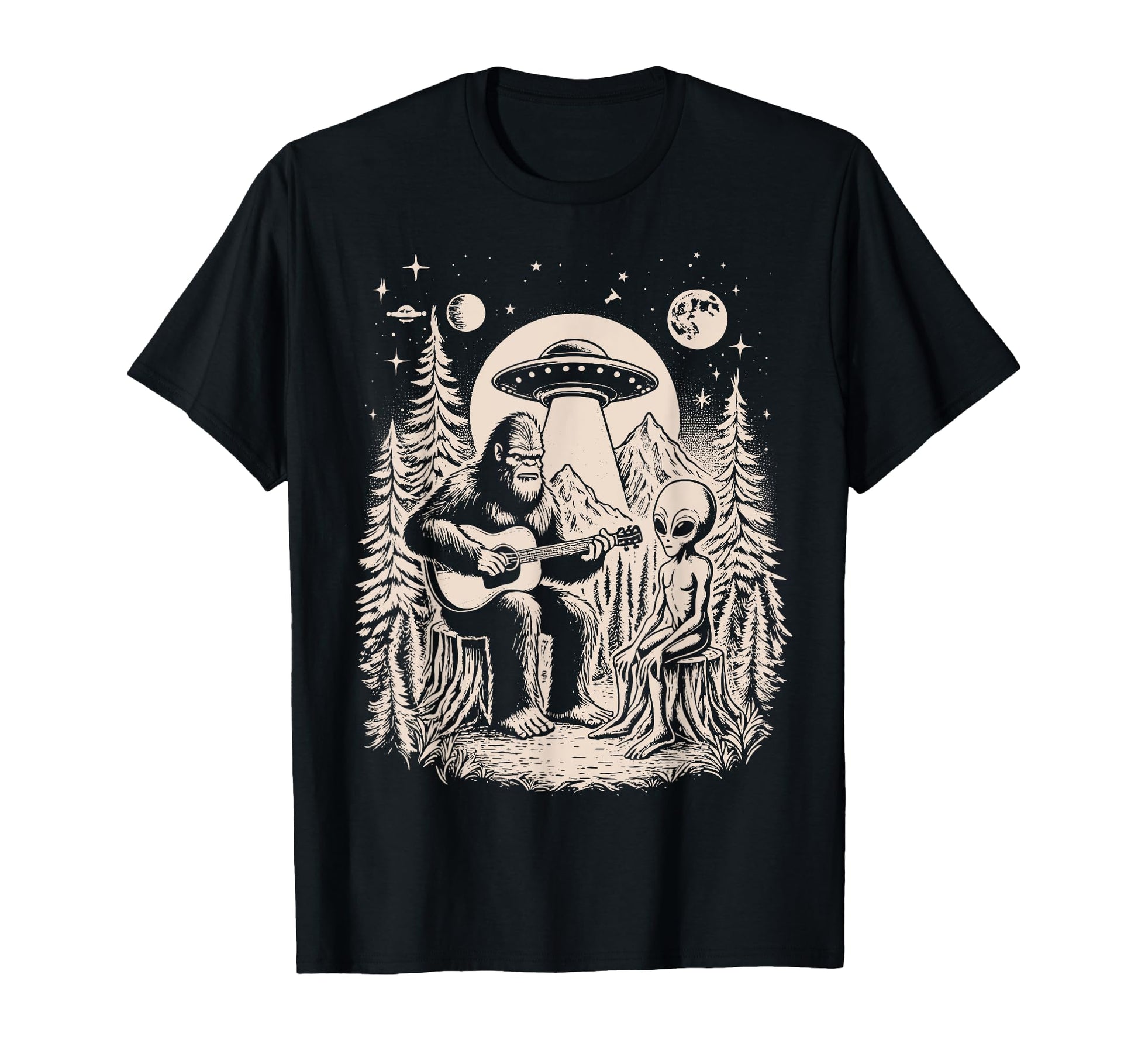 Funny Big Foot Alien Spaceship Big Foot Sasquatch Ape Guitar T-Shirt