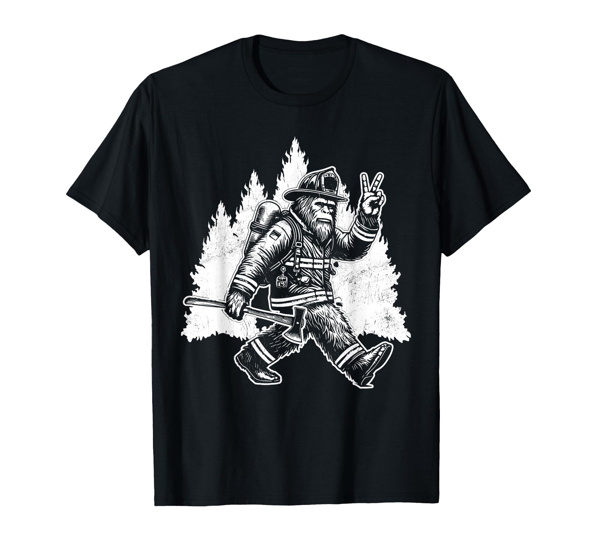 Funny Bigfoot Firefighter Sasquatch Design Men's Retro Bigfoot Firefighter Sasquatch Fireman T-Shirt - Black, Small, Short Sleeve