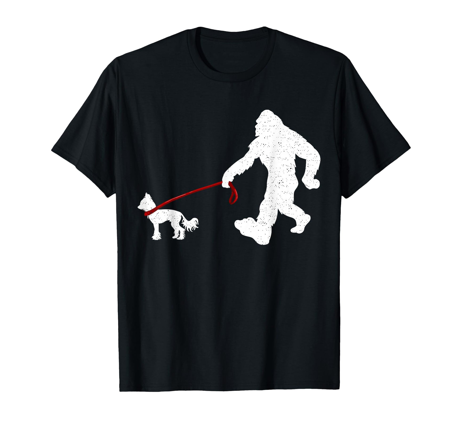 Funny Bigfoot Walking With Chinese Crested Dog Gifts T-Shirt
