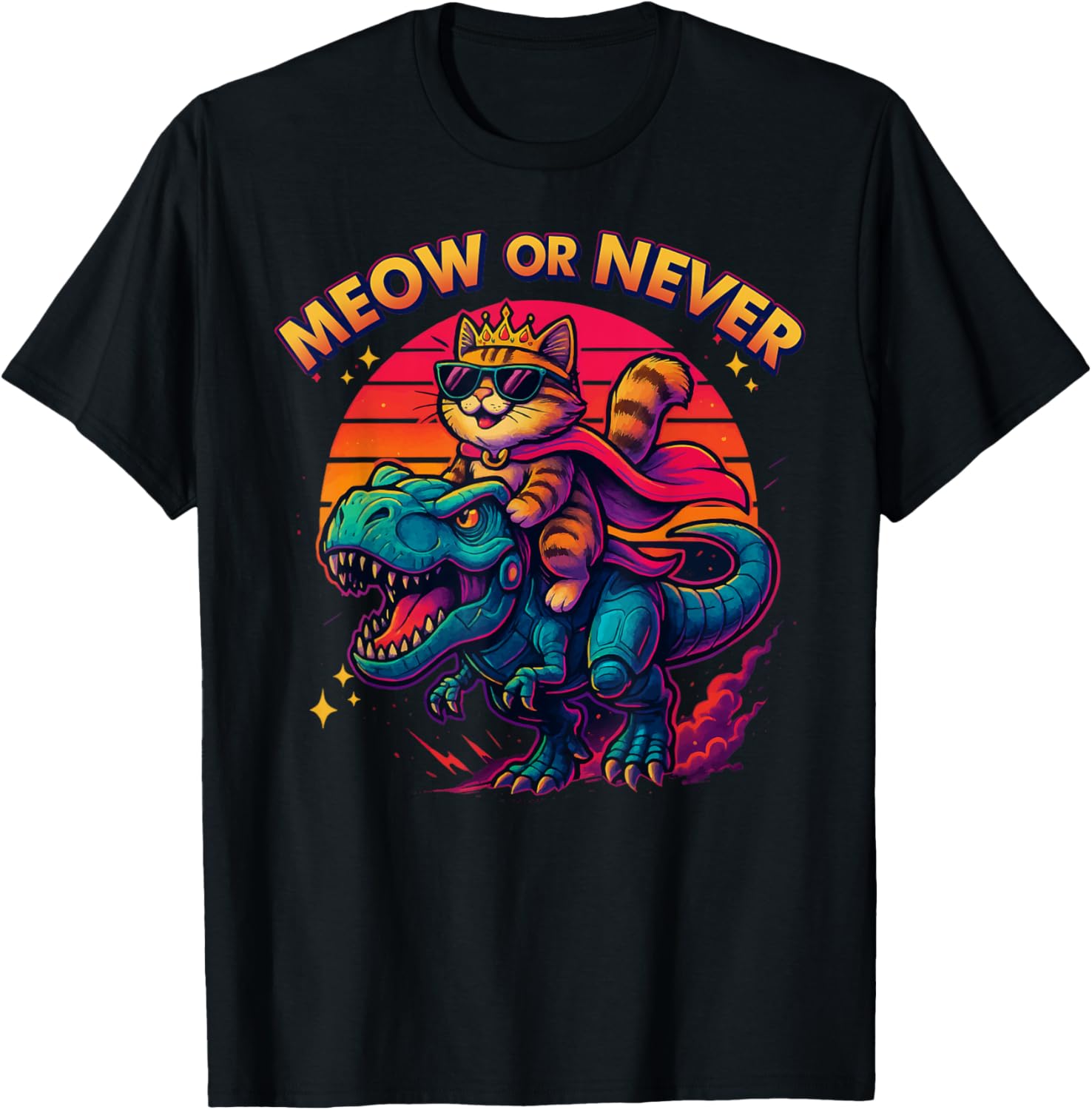 Funny Cat King Riding Dinosaur T-Rex - Meow or Never Retro Men Women Kids T-Shirt